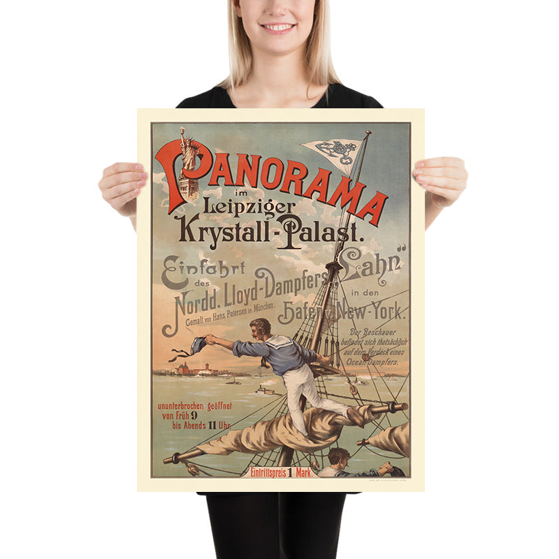 Panorama in Leipziger. Krystall-Palast (1890) is a striking late-19th-century travel poster by an anonymous lithographer working in Leipzig, Germany. Created to promote a panoramic spectacle at the city’s famed Krystall-Palast entertainment complex, the design captures the excitement of the age: transatlantic steamship travel, grand urban skylines, and the promise of modernity. With the Statue of Liberty rising in the distance, the poster deftly links Leipzig’s cosmopolitan stage culture to the magnetic pull of New York, embodying the era’s Art Nouveau-inflected elegance and its fascination with industry, leisure, and global horizons.