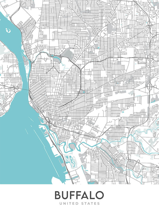 Cette carte de Buffalo, New York, est un plan de rue moderne et détaillé sans étiquettes. Il se concentre sur la ville de Buffalo et ses environs, offrant une représentation précise et visuellement attrayante de la configuration de la ville. La carte couvre un large éventail de quartiers, notamment Allentown, Black Rock, Elmwood Village et North Buffalo, chacun avec son caractère et son charme uniques.