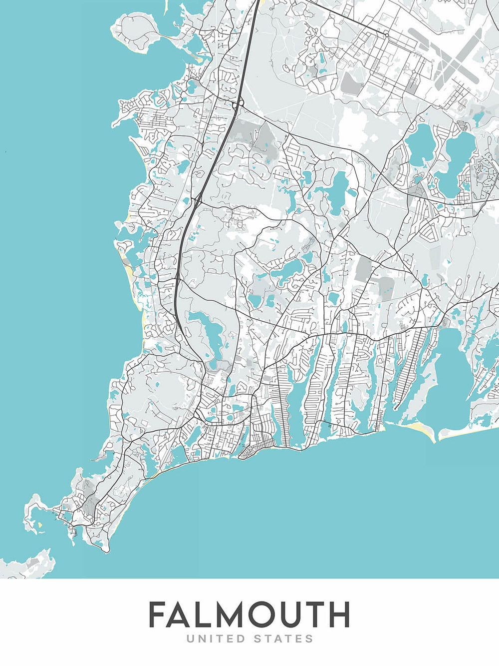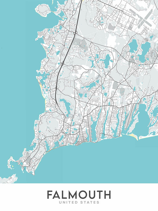 Cette carte de Falmouth, Massachusetts, est un plan de rue moderne et détaillé sans étiquettes. Il se concentre sur le centre-ville et ses environs, offrant une représentation précise et visuellement attrayante de cette charmante ville côtière. La carte couvre une superficie d'environ 9 miles d'ouest en est et de 11 miles du nord au sud, offrant une vue complète des divers quartiers, monuments et caractéristiques naturelles de Falmouth.