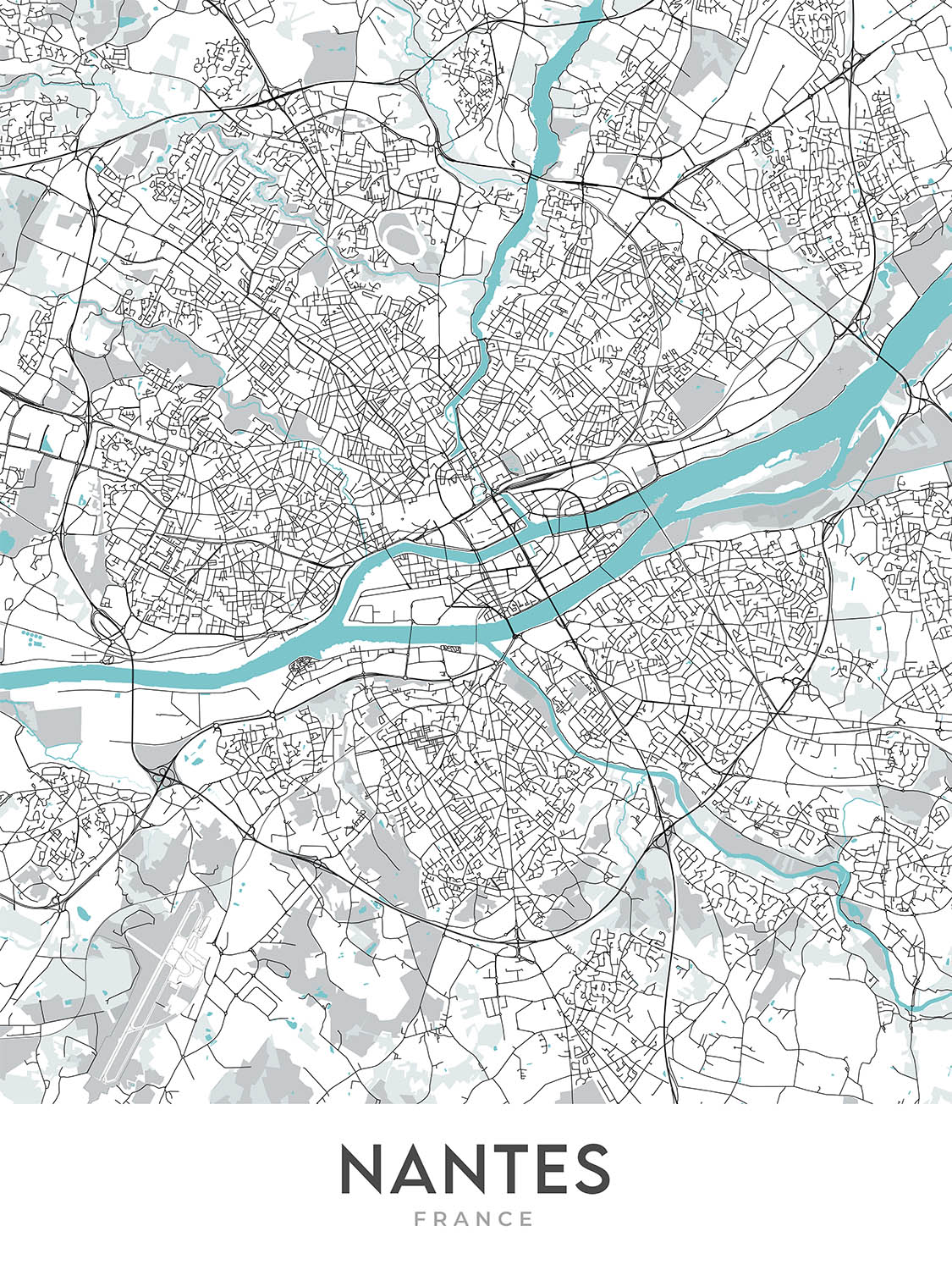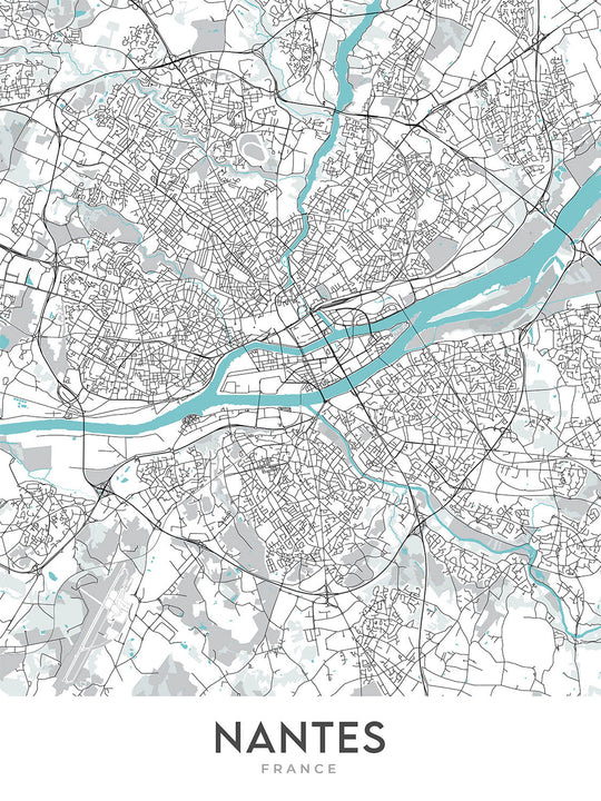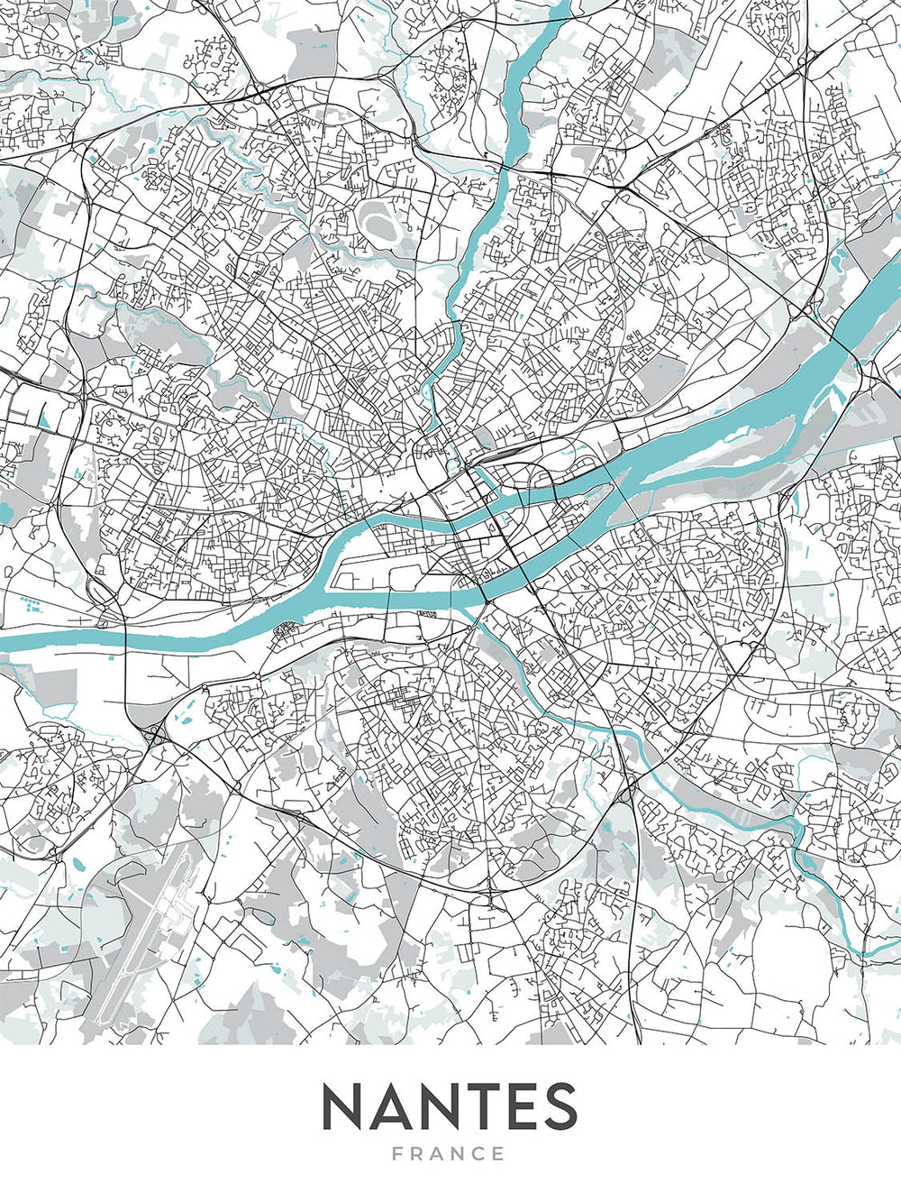 Cette carte de Nantes, en France, est un plan de rue moderne et détaillé qui se concentre sur les quartiers animés, les routes principales et les monuments emblématiques de la ville. La carte couvre une zone rectangulaire qui englobe le centre-ville et s'étend aux zones environnantes, offrant une vue complète de la configuration et de la géographie de la ville.