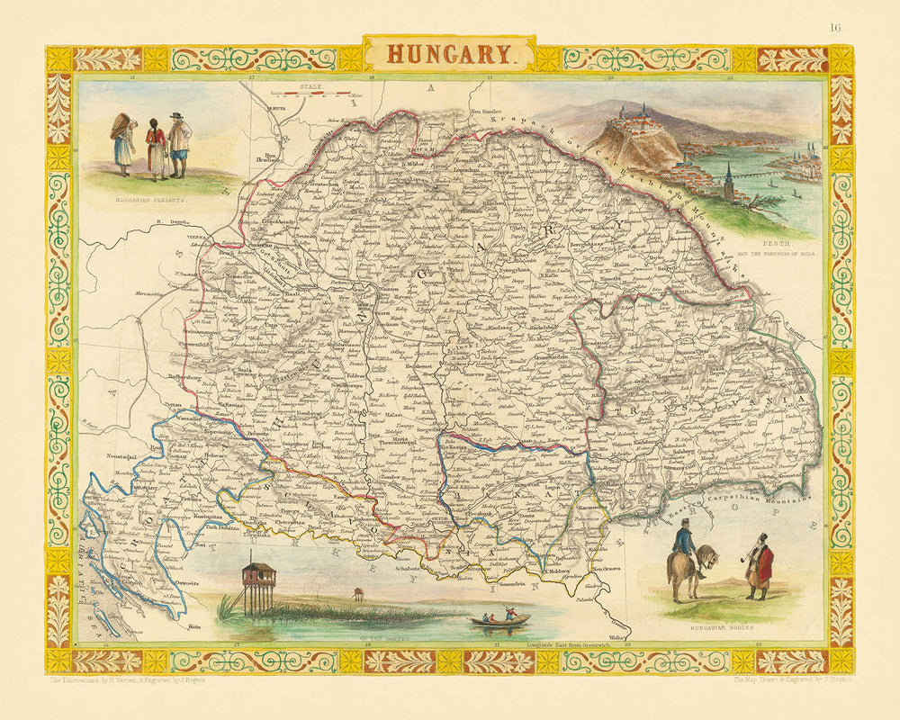 Le travail de John Tallis se distingue par ses vignettes élaborées, et cette carte ne fait pas exception. Elle présente des scènes évocatrices de nobles hongrois et de paysans, aux côtés d'une vue pittoresque de Pesth et de la forteresse de Buda. Ces illustrations offrent un aperçu du tissu social de la Hongrie à cette époque, reflétant les traditions et la vie quotidienne de son peuple. L'inclusion d'une scène sur le fleuve Danube enrichit encore la carte, soulignant l'importance de cette voie navigable vitale dans l'histoire et l'économie de la Hongrie.