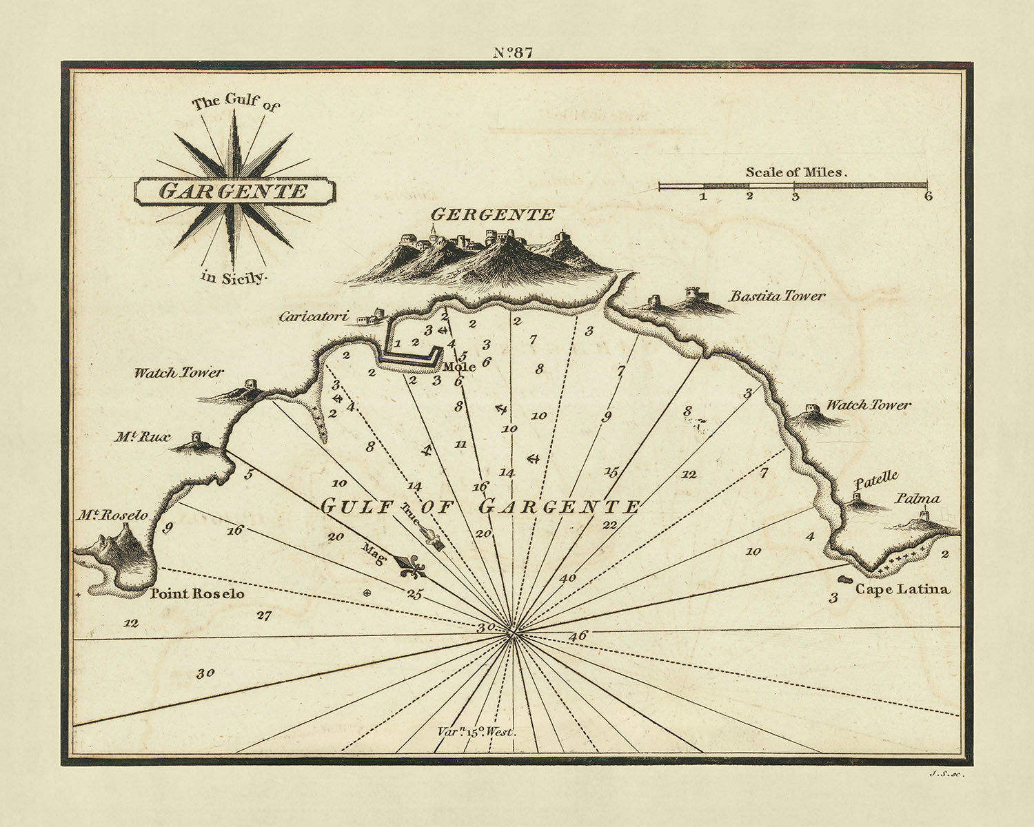 Ancien Golfe de Gargente, Carte Nautique de Sicile par Heather, 1802: Agrigento, Monte Rux, Rose des Vents