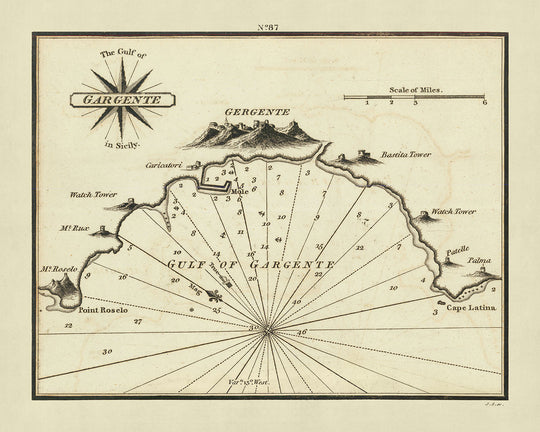 La carte détaille méticuleusement le Golfe d'Agrigente, maintenant connu sous le nom de Golfe de Gargente, capturant l'essence de cette côte sicilienne historique. Elle présente des points de repère clés tels que les villes de Gergente (l'Agrigente moderne), Caricatori et Palma, ainsi que des formations naturelles comme M. Rux (Monte Rux), le Point Roselo et le Cap Latina. L'inclusion de spécificités maritimes telles que les profondeurs d'eau en brasses, les tours de guet et une jetée, offre un aperçu de l'importance stratégique et de la vulnérabilité de cette zone au début du 19ème siècle.
