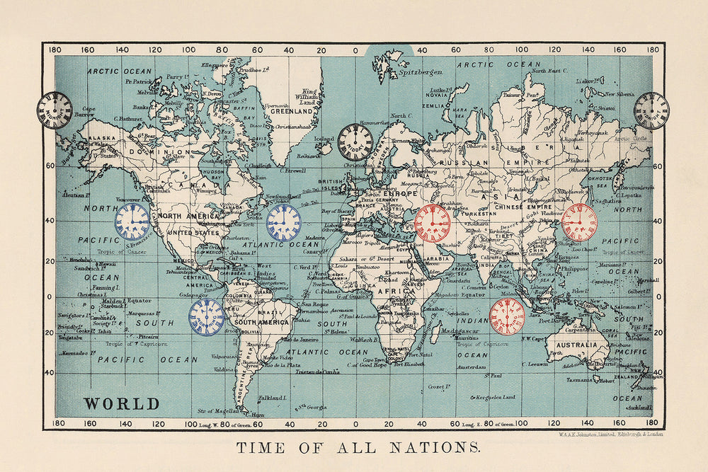 Carte du monde des anciens fuseaux horaires par AK Johnston, 1906