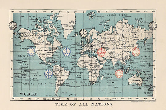 Le « Temps de toutes les nations – Carte du monde » créé par AK Johnston en 1906 est une pièce captivante qui illustre de manière complexe les fuseaux horaires du monde et les réseaux de communication mondiaux. Cette carte thématique infographique donne un aperçu du monde tel qu'on l'entendait au début du XXe siècle, avec un accent particulier sur la synchronisation du temps entre différentes régions. La carte présente diverses « horloges de fuseau horaire » qui indiquent les heures locales dans différentes parties du monde lorsqu'il est midi à Londres, offrant ainsi un aperçu fascinant des relations temporelles entre différents emplacements géographiques.