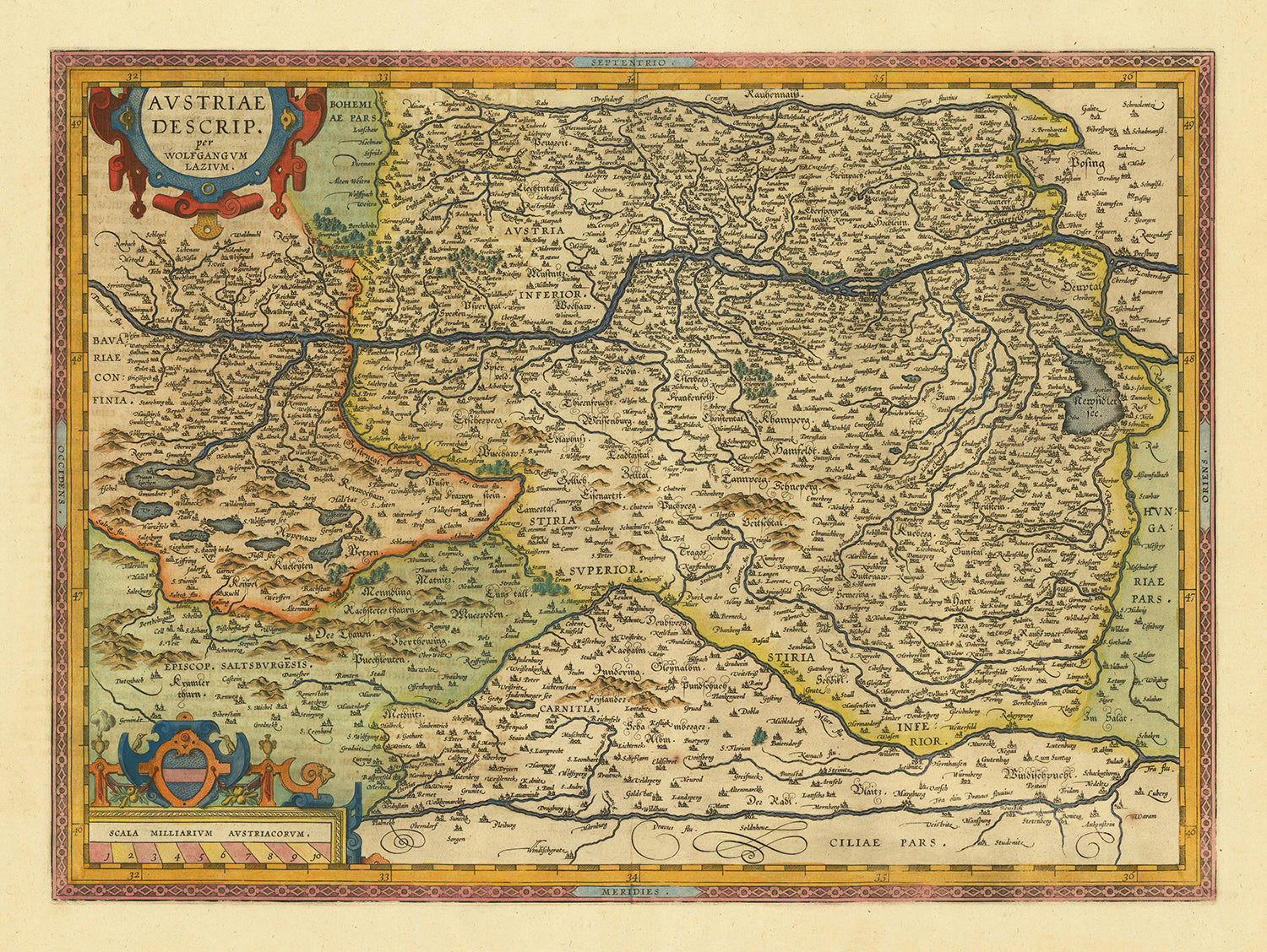 Ce qui rend cette carte particulièrement intéressante est le reflet du contexte géopolitique de la fin du XVIe siècle. Au moment de sa création, l'Autriche faisait partie de la puissante monarchie des Habsbourg, qui dominait une grande partie de l'Europe. La carte offre ainsi un instantané d’une époque où les frontières étaient fluides et soumises aux caprices de puissants monarques. De plus, le créateur de la carte, Abraham Ortelius, est connu comme l'inventeur de l'atlas moderne, ce qui fait de cette pièce non seulement une carte, mais un morceau d'histoire cartographique. Son approche innovante de la cartographie est évidente dans les rendus détaillés des villes, des plans d'eau et d'autres caractéristiques géographiques, faisant de cette carte un ajout précieux à toute collection.