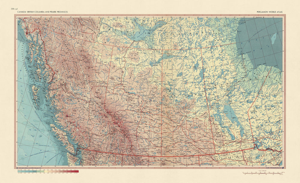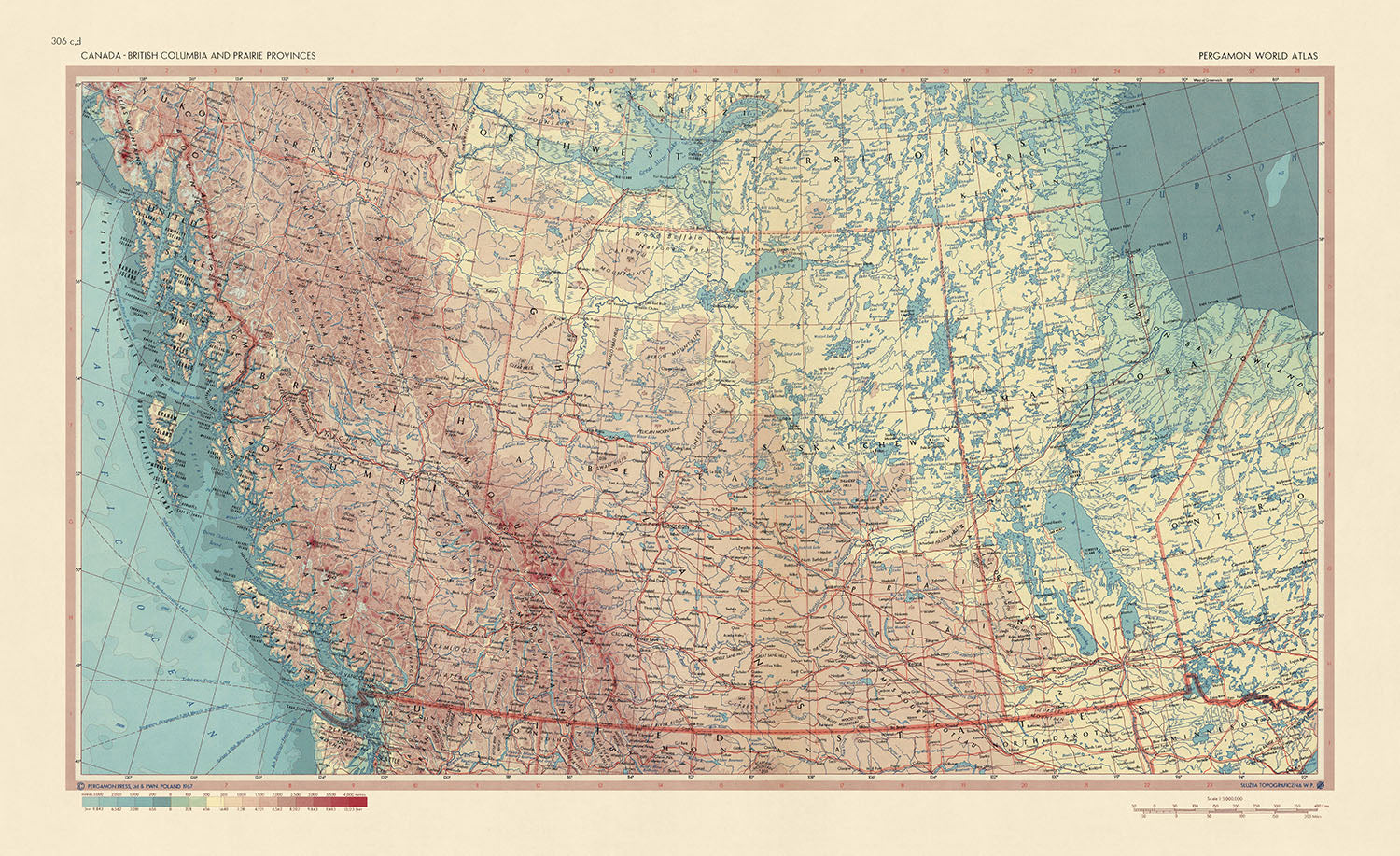 Cette carte, dans son style politique et physique détaillé, dresse un tableau vivant de la géographie du Canada. Le détail complexe des frontières politiques, du niveau provincial au niveau municipal, témoigne de la dévotion du cartographe à la précision. Elle offre un aperçu intrigant du paysage politique de l'époque, reflétant le contexte historique de la fin des années 1960. Les aspects physiques de la carte sont tout aussi impressionnants, avec la topographie de la région magnifiquement représentée à travers des lignes de contour détaillées et des ombrages. La représentation des montagnes Rocheuses, des prairies et des régions côtières de la Colombie-Britannique est particulièrement frappante.
