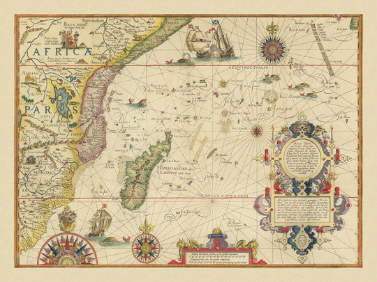 La carte elle-même est un festin visuel, vivante de drame maritime et de détails exotiques. Ses côtes fourmillent de ports nommés—Mozambique, Sofala, Melinde, Mombasa, Zanzibar et Mogadishu—chacun étant un nœud vital dans le réseau du commerce de l'océan Indien. À l'intérieur des terres, le légendaire Royaume de Prêtre Jean est illustré en Éthiopie, tandis que le mystérieux Lac Zaflan, considéré à l'époque comme une source du Nil, ancre les mystères du continent. Des roses des vents ornées, des navires de guerre en bataille, et des monstres marins fantastiques animent les eaux, reflétant à la fois les dangers et l'attrait des mers inexplorées.