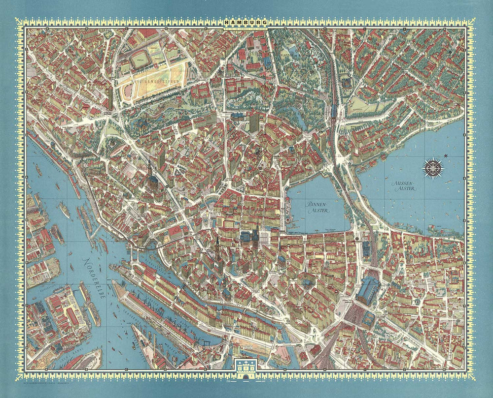 À l'époque où cette carte a été créée, Hambourg était une ville portuaire animée et une plaque tournante du commerce international. La ville a été lourdement bombardée pendant la Seconde Guerre mondiale, et une grande partie de son architecture historique a été détruite. Cependant, Hambourg a été reconstruite depuis et est aujourd'hui connue pour sa vie nocturne animée, ses musées de classe mondiale et sa scène artistique florissante. La ville accueille également plusieurs événements culturels importants, notamment la foire Hamburger Dom et le Festival international du film de Hambourg. Dans l'ensemble, cette carte donne un aperçu fascinant du passé et du présent de Hambourg. Elle est incontournable pour tous ceux qui s'intéressent à la riche histoire de la ville.