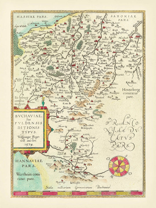 Ortelius, une figure clé de l'histoire de la cartographie, a révolutionné la manière dont les cartes étaient créées et perçues. Son travail sur Theatrum Orbis Terrarum a établi de nouvelles normes pour la précision et l'exhaustivité dans la cartographie. Le "Bvchaviae, sive Fvldensis Ditionis Typus" témoigne de son attention méticuleuse aux détails et de sa capacité à allier précision scientifique et beauté artistique. La carte sert non seulement de guide géographique mais aussi d'œuvre d'art, avec son cartouche décoratif et sa rose des vents ajoutant une touche d'élégance.
