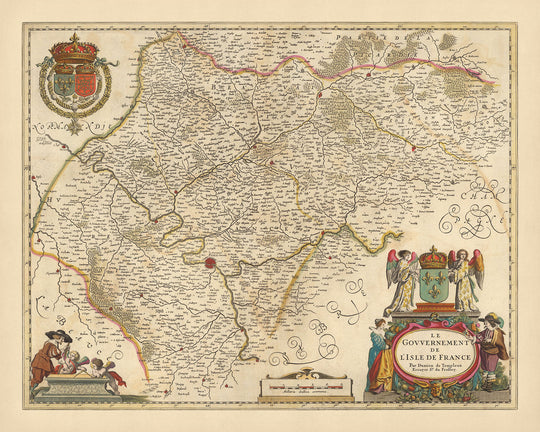 En plus des villes, la carte met également en évidence divers points de repère et caractéristiques géographiques. L'une de ces caractéristiques est le Parc Naturel Régional du Vexin Français, une zone protégée composée de forêts, de terres agricoles et de villes historiques. Cette carte est plus qu'une simple représentation géographique ; c'est une œuvre d'art. Les contours colorés à la main, les détails gravés et les cartouches décoratives ajoutent à son attrait esthétique. Il présente également les armoiries, symbole de fierté et d’identité, enrichissant encore sa valeur historique.