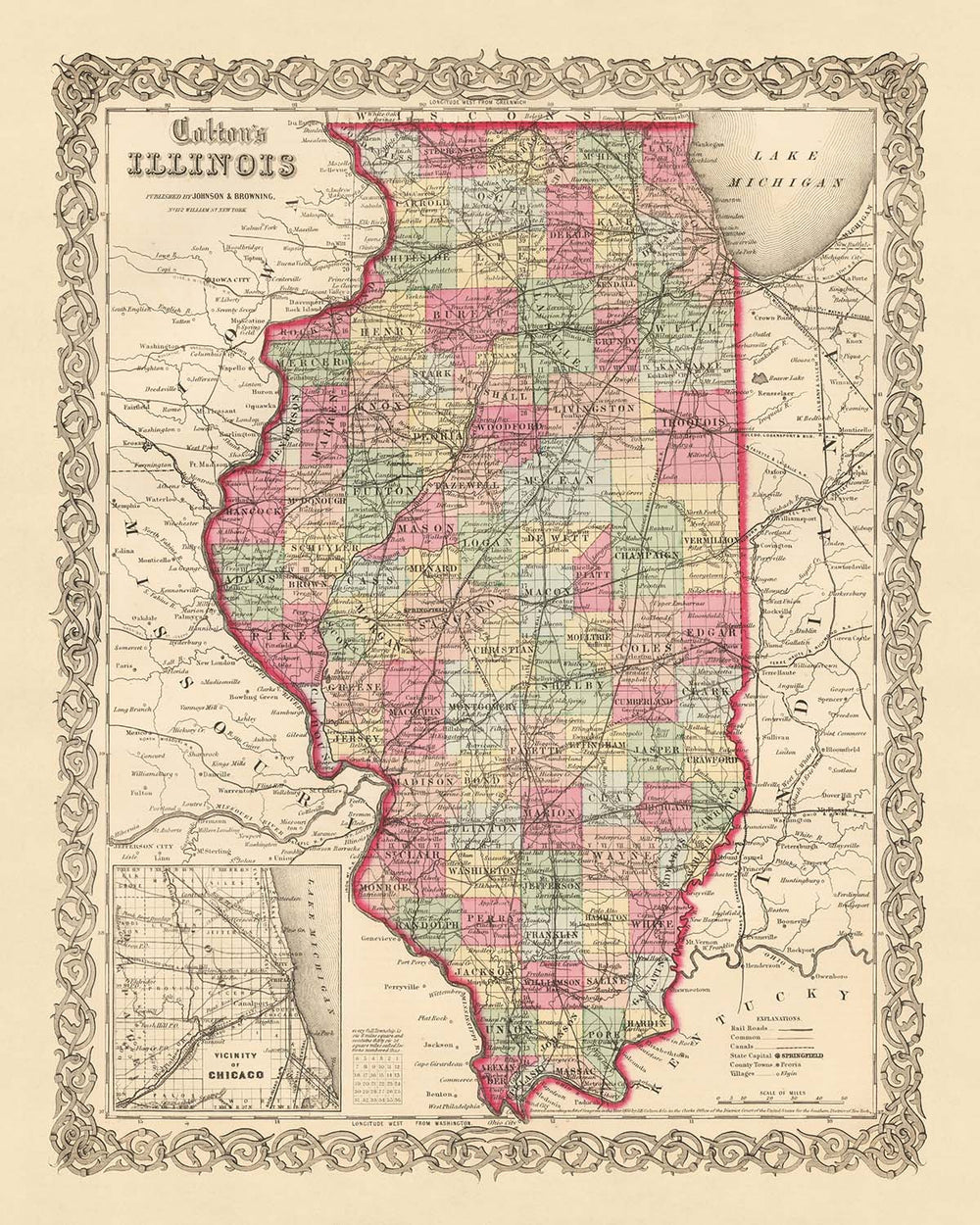 La carte témoigne de l’esprit pionnier des États-Unis dans les années 1850. À cette époque de l’histoire, de nombreuses colonies n’avaient pas encore été fondées et le paysage était en constante évolution. La carte reflète ce sentiment de changement et de croissance, de nombreux noms et frontières ayant probablement changé au cours des 150 années écoulées. La carte constitue un instantané d'un moment donné, offrant un aperçu du développement précoce de l'Illinois et des États-Unis dans leur ensemble.