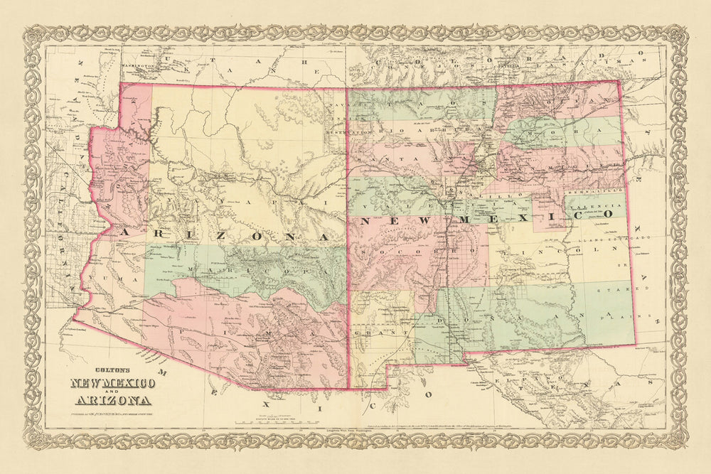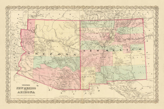 Plongez-vous dans la riche histoire des États-Unis avec cette carte méticuleusement conçue de 1873 du Nouveau-Mexique et de l'Arizona, réalisée par le célèbre cartographe JH Colton. Cette pièce exquise offre un rare aperçu du développement précoce de ces régions, à une époque où de nombreuses colonies en étaient encore à leurs balbutiements et où le paysage des États-Unis évoluait rapidement. En tant que l'un des meilleurs cartographes américains de son époque, le travail de Colton se caractérise par son attention exceptionnelle aux détails et à sa précision, offrant une fenêtre unique sur le passé.