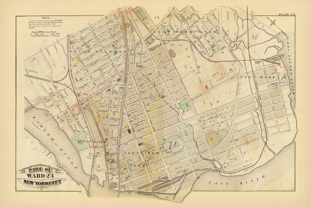 • Régions montrées : South Melrose, East Morrisania, Mott Haven, North New York, Port Morris et Mount Buena Grove.