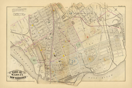 G.W. Bromley, renommé pour ses atlas urbains détaillés, met son expertise à profit dans cette carte, fournissant une ressource inestimable pour les historiens et les passionnés d'urbanisme. La carte délimite non seulement les frontières du quartier 23, mais met également en évidence les lignes de ferme d'origine, les cours d'eau et les limites des quartiers, offrant une perspective unique sur l'évolution historique de l'infrastructure de New York. L'attention portée par Bromley aux détails est évidente dans la représentation précise des bâtiments, des bouches d'incendie, des chemins de fer à vapeur et de rue, ainsi que des conduites d'eau, faisant de cette carte un document vital pour comprendre le passé de la ville.