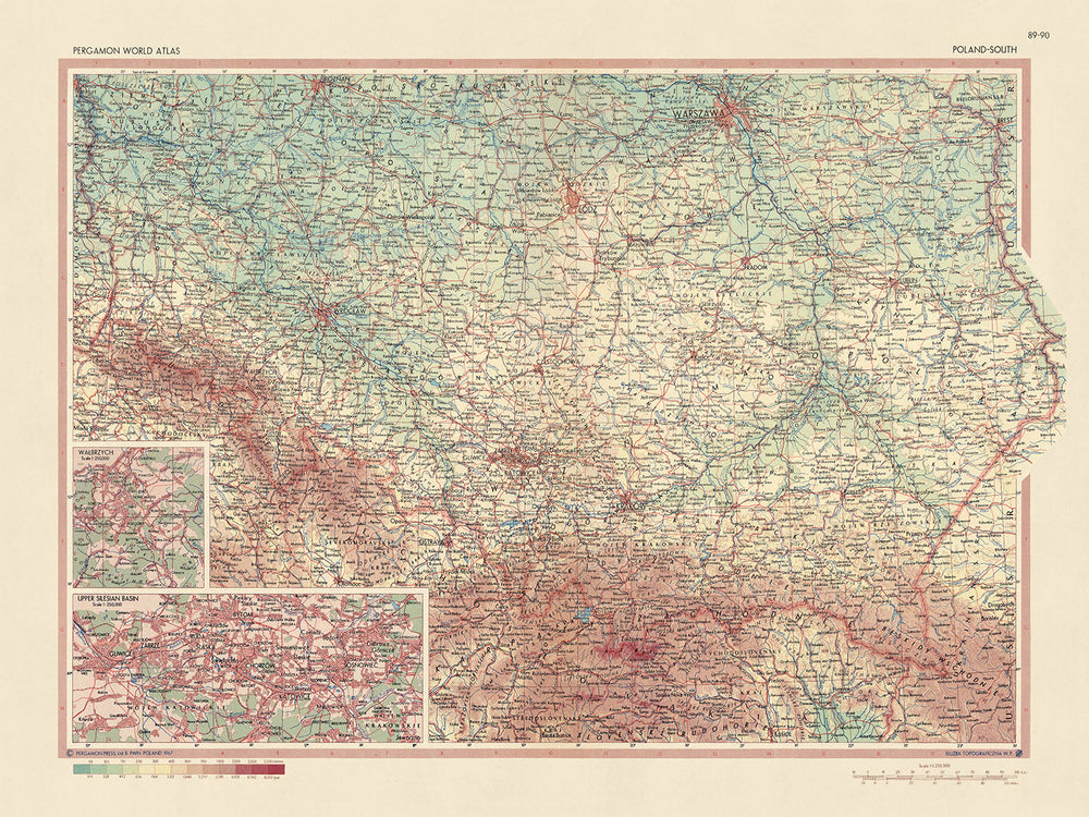 Cette carte de 1967 du sud de la Pologne, publiée par le Service topographique de l'Armée polonaise, est une carte politique et physique détaillée qui offre un aperçu complet de la région. La carte couvre la moitié sud de la Pologne, avec Varsovie et Poznań le long du bord supérieur de la carte. Elle inclut des insets de Wałbrzych et du Bassin de Haute-Silésie.