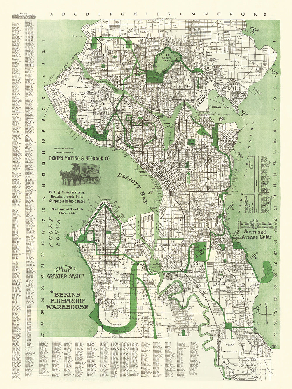 Ancienne carte de Seattle, 1913 :  marché de Pike Place, Université de Washington, Green Lake, Lake Washington, Smith Tower