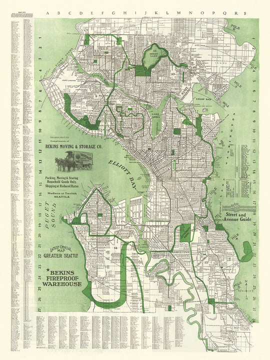 Un autre aspect intéressant de la carte est sa représentation des caractéristiques naturelles de la ville. La carte montre l'emplacement de plusieurs lacs, y compris Green Lake et Lake Union, ainsi que la rivière Duwamish. Ces caractéristiques naturelles ont joué un rôle important dans le développement de la ville, fournissant une source d'eau, de transport et de loisirs. La carte montre également l'emplacement de plusieurs parcs, y compris Volunteer Park et Seward Park, qui ont été des espaces verts importants pour les habitants de la ville pendant des générations.