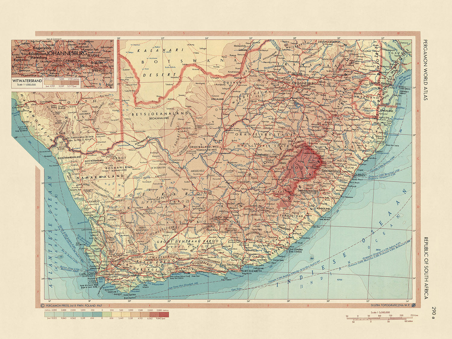 Cette carte de 1967 de la République d'Afrique du Sud, publiée par le Service topographique de l'armée polonaise, est une carte politique et physique détaillée qui fournit un aperçu complet de la géographie et du paysage politique du pays. La carte couvre l'intégralité de l'Afrique du Sud, en mettant l'accent sur sa topographie, ses grandes villes et ses monuments importants.