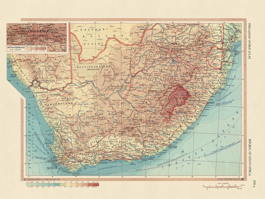 Ancienne carte de la République d'Afrique du Sud, 1967: Johannesburg, Le Cap, Parc national Kruger, Monts Drakensberg