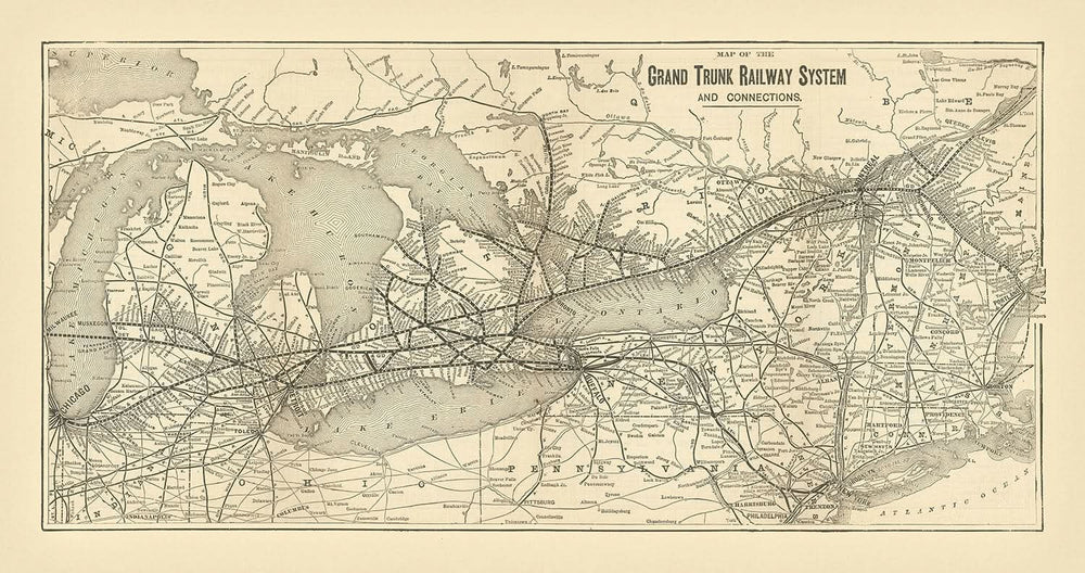 Cette carte couvre une vaste zone géographique, y compris des parties du Canada et des États-Unis. Elle s'étend de Portland, Maine, à Montréal, Ontario, et encore plus à l'ouest jusqu'à Détroit, Chicago et Milwaukee. La carte présente également des repères naturels significatifs tels que les Grands Lacs, le fleuve Saint-Laurent, et les montagnes Adirondack, Green et White. Ces caractéristiques ne sont pas seulement des repères géographiques, mais ont également joué des rôles cruciaux dans le développement et l'expansion du système ferroviaire.