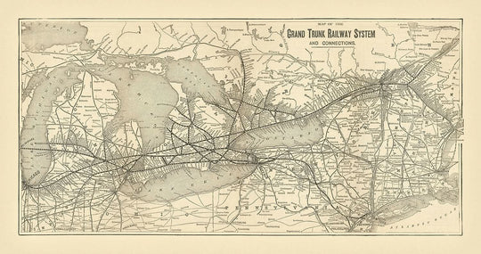 Historiquement, le Grand Trunk Railway a été constitué en 1852, avec l'ambitieux objectif de relier Montréal et Toronto. Dans les années 1880 et 1890, il avait atteint son zénith, s'étendant aux États-Unis et réduisant la dépendance du Canada à l'égard du commerce maritime britannique. Cette carte reflète le sommet du chemin de fer, mettant en avant son vaste rayonnement et le rôle critique qu'il a joué dans la promotion de l'indépendance économique et de la croissance au Canada.