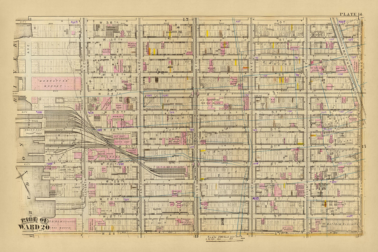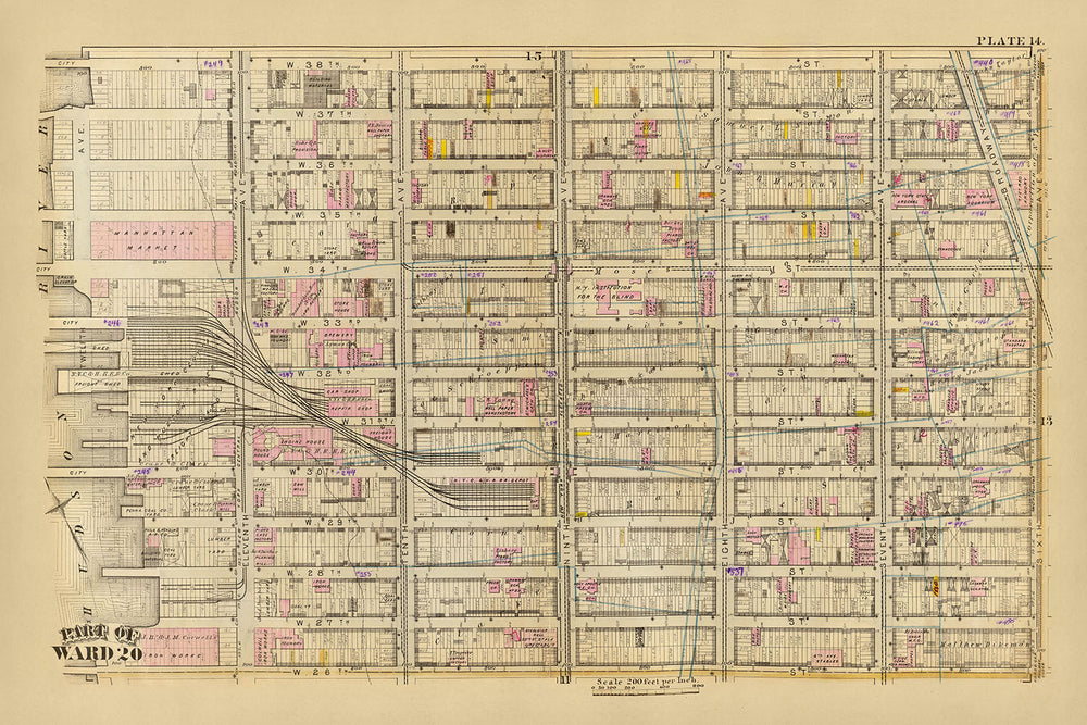 Ancienne carte du quartier 20, New York, 1879 : Garment District, New York Central et Hudson River Freight Yard, Manhattan Market, New York Aquarium