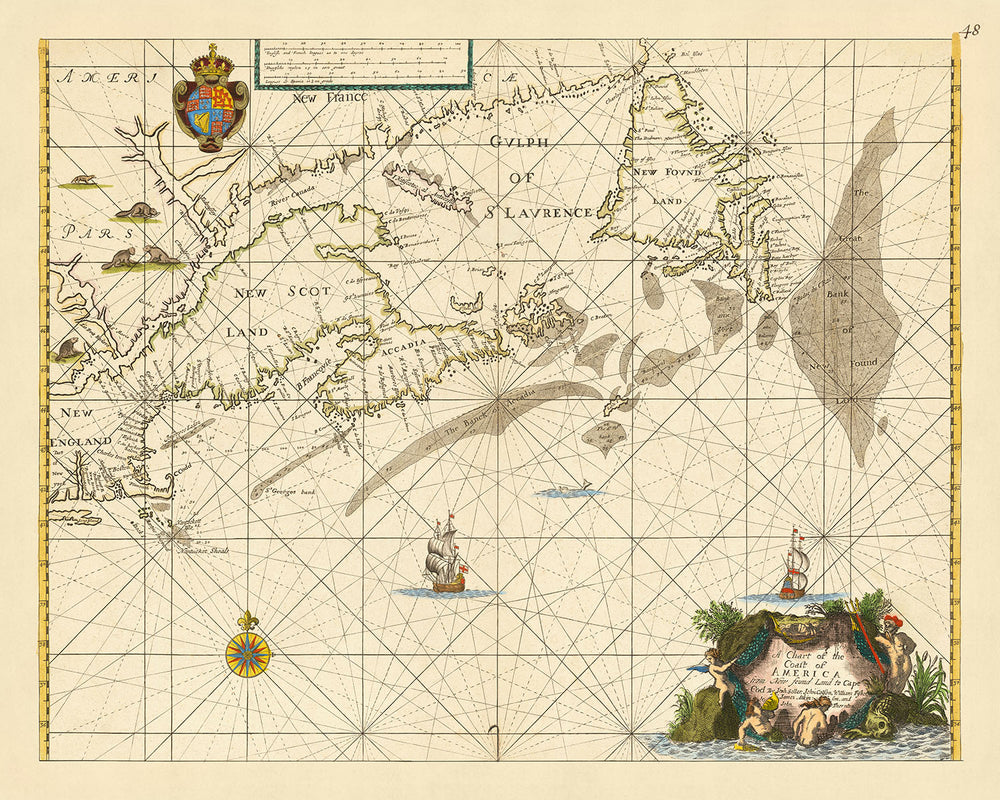 En plus des améliorations mentionnées ci-dessus, la carte dispose également d'une bien meilleure connaissance des colonies anglaises en Nouvelle-Angleterre, ajoutant Boston et Charlestown (la première précédemment appelée "Briston"), ainsi que New London et "Plimouth". La bathymétrie des bancs au large du Canada et de la Nouvelle-Angleterre est considérablement améliorée, avec des dizaines de sondages à travers les principaux bancs. Laurence Worms, dans son essai sur Seller et Pepys, loue la cartographie nord-américaine de Seller comme ayant un mérite substantiel, notant que Seller était plutôt plus intéressant et original dans son travail de représentation cartographique des colonies britanniques en Amérique du Nord. En résumé, 'Une carte de la côte de l'Amérique de Terre-Neuve au Cap Cod' est un artefact remarquable qui offre non seulement des aperçus inestimables sur l'histoire et la géographie de l'Amérique du Nord, mais qui met également en valeur les réalisations artistiques et scientifiques de ses créateurs.