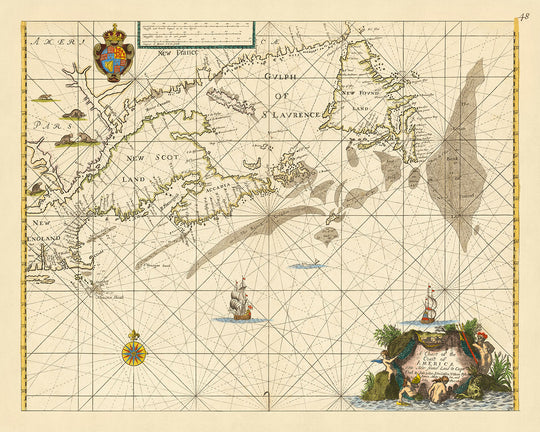 Le style de la carte est caractéristique des cartes nautiques de l'époque, combinant attrait esthétique et utilité pratique. La carte suit de près le contour de la carte emblématique du cartographe néerlandais Joannes van Loon, mais avec des améliorations significatives et de nouvelles informations. Par exemple, la carte inclut l'île Saint-Jean (ou l'île du Prince Édouard), qui a été omise par Van Loon et n'a pas été remplacée par un autre cartographe jusqu'à présent. Elle améliore également la représentation de la péninsule d'Avalon à Terre-Neuve grâce aux connaissances anglaises acquises par John Mason. Le R. Sauguenay et Les Trois Rivières sont tous deux insérés en détail, étendant la zone de couverture vers l'ouest pour inclure la colonie anglaise en Nouvelle-Angleterre.