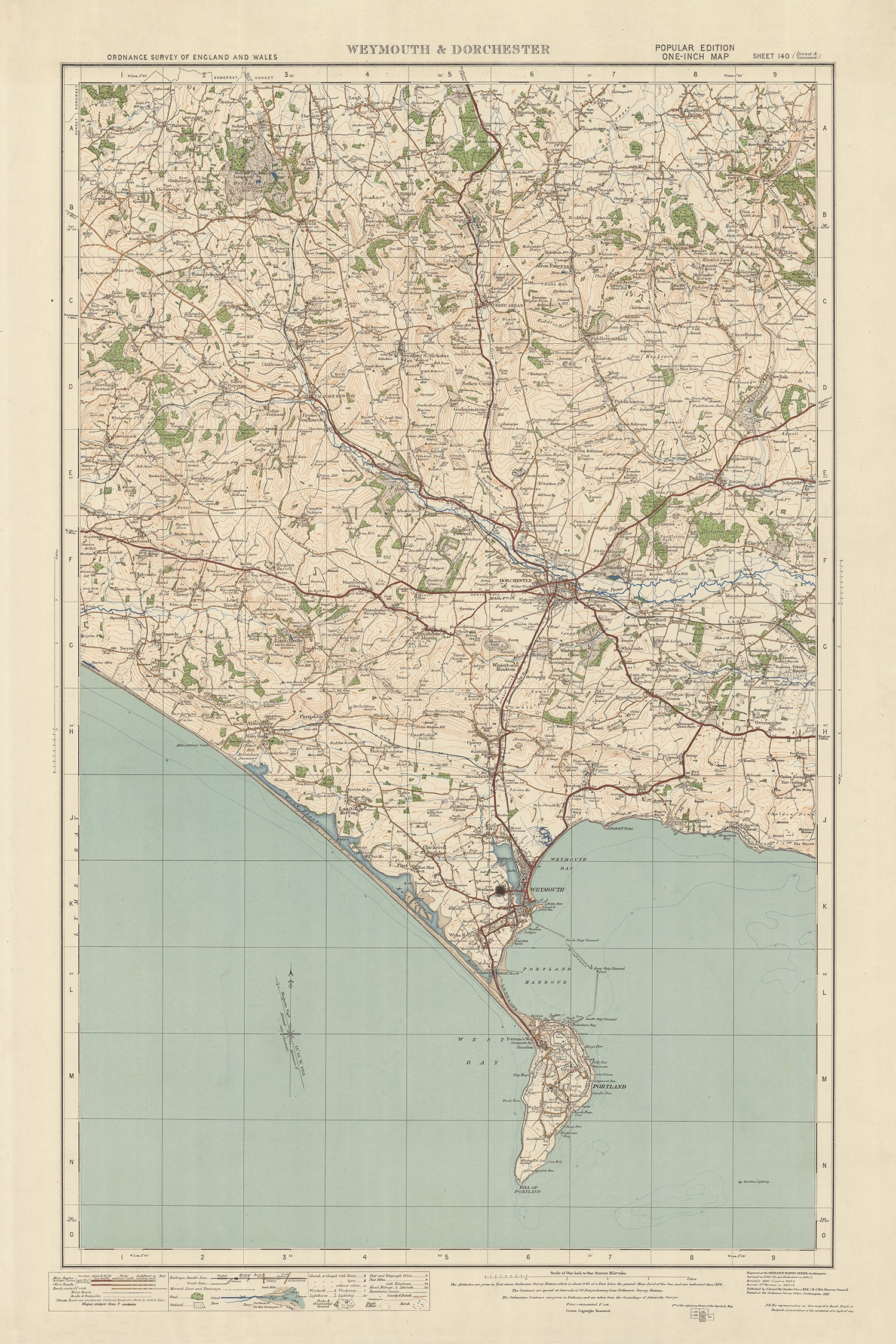 Carte Old Ordnance Survey, feuille 140: Weymouth & Dorchester, 1925 : Cerne Abbas, Puddletown, Abbotsbury, île de Portland, Dorset AONB