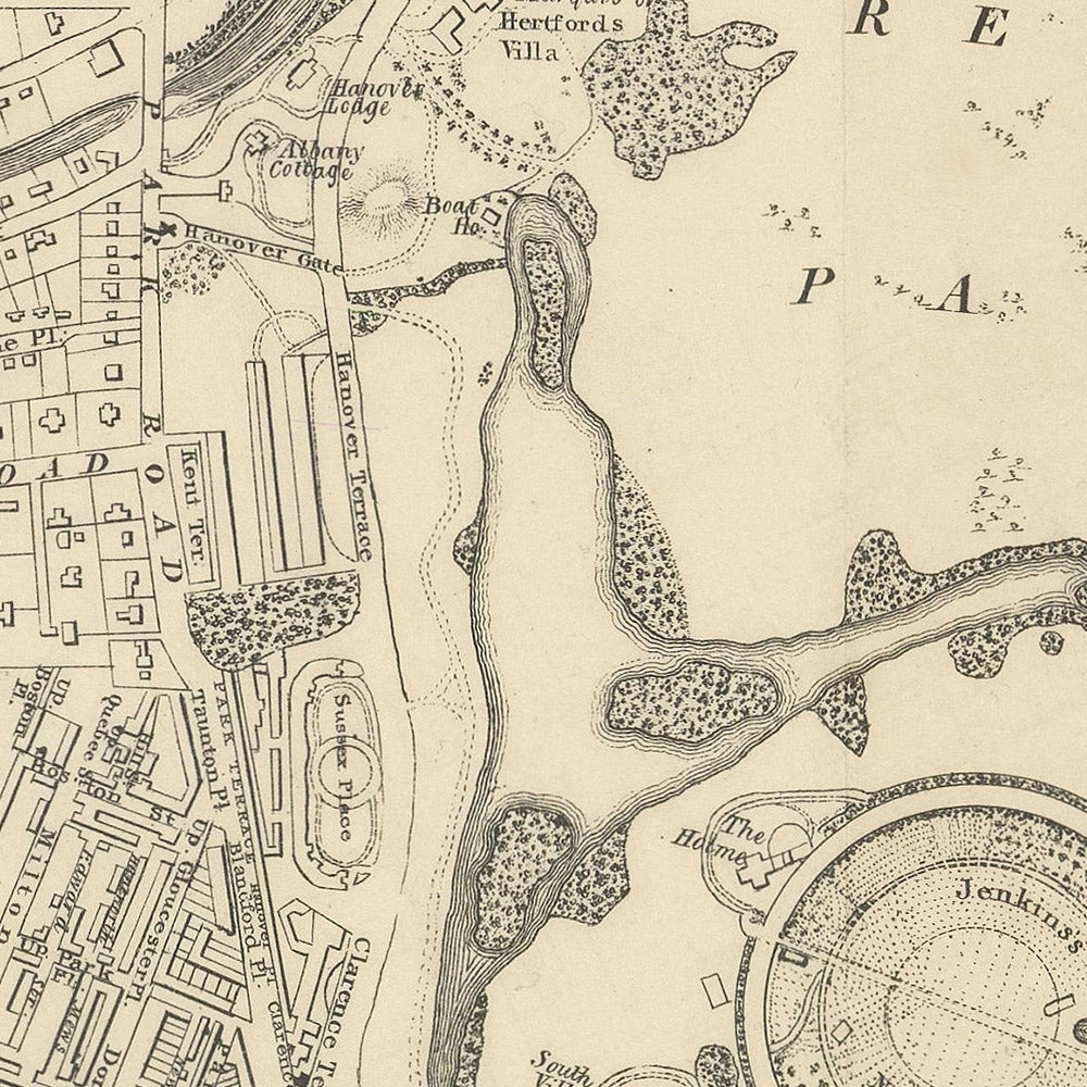 To the north, Regents Park anchors a grand composition of promenades and terraces, with York Terrace West and Park Square set out with ceremonial clarity. Adjacent, the famed Diorama—a marvel of immersive spectacle—signals the era’s appetite for innovation and display. Crossing into St John’s Wood, Lord’s Cricket Ground appears as a sporting enclave amid open margins, its relationship to St John’s Wood Farm and the partially constructed Hamilton Terrace revealing a suburban landscape in swift transition from pasture to villa. The map’s careful delineation of these spaces shows not only where London was, but where it was going—an invaluable urban narrative told through geometry and green.