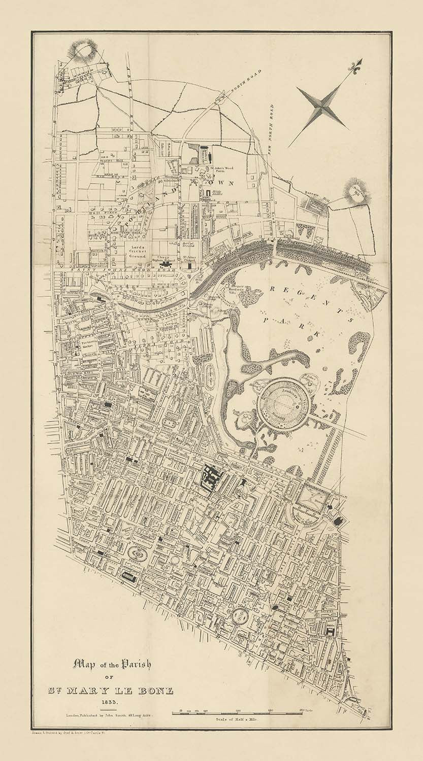 Old Parish Map of London by Graf & Soret, 1833: Marylebone, Regent's Park, Lord's, Baker St, St John's Wood