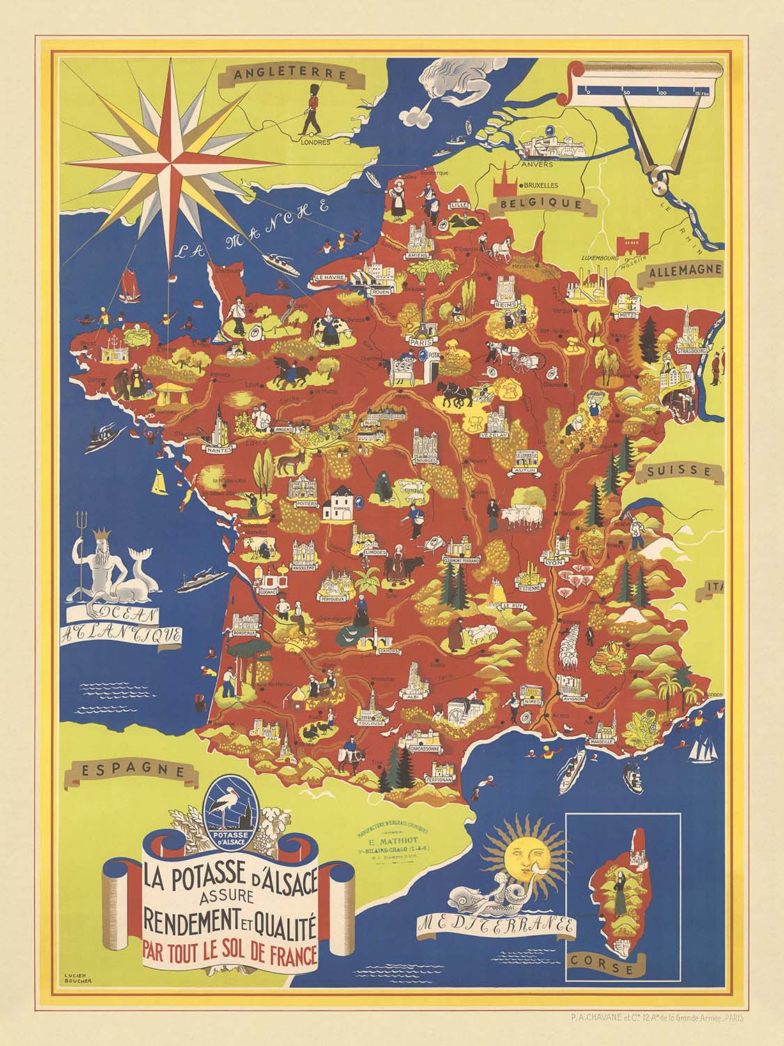 Entrez dans le monde vibrant de la cartographie française du milieu du siècle avec "La Potasse D'Alsace Assure Rendement et Qualite Par Tout Le Sol De France," une carte picturale captivante réalisée par l'artiste célèbre Lucien Boucher en 1950. Cette œuvre est plus qu'une carte—c'est un manifeste visuel, louant l'abondance agricole apportée par la potasse renommée d'Alsace. Le titre français original, élégamment affiché dans une bannière décorative, encapsule l'optimisme de la France d'après-guerre, lorsque l'innovation scientifique et la fierté régionale convergeaient pour promettre abondance et renouveau à travers les sols fertiles de la nation.