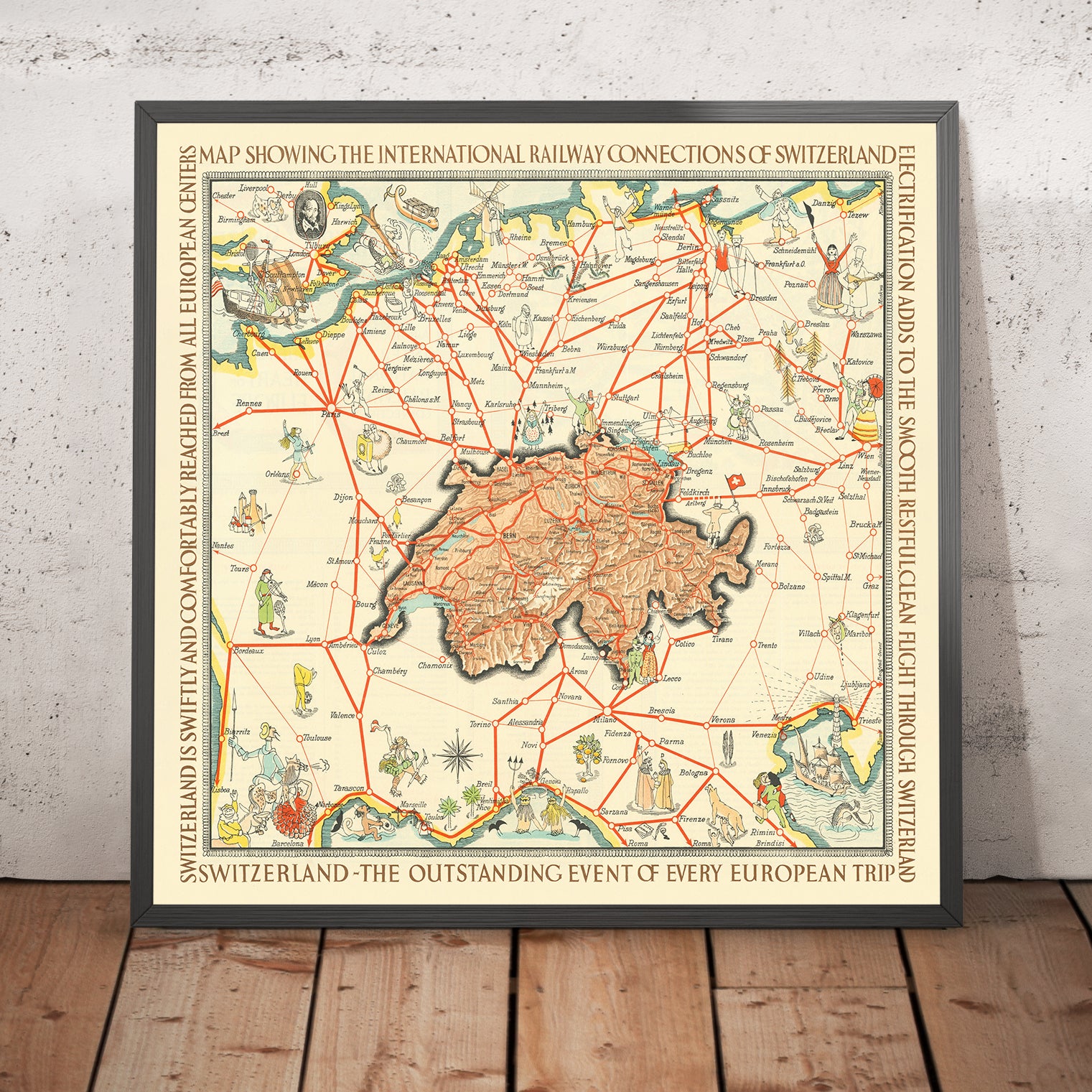 Topography is treated not as obstacle but spectacle. Mountain chains rise in stylized serrations; valleys and lakes open corridors where the rails glide toward neighboring realms. Major cities are crisply lettered along the lines, anchoring the eye to an itinerary that feels both inevitable and exhilarating. The decorative flourishes along the frame—ships under sail, comedic figures—echo the inner playfulness, while the disciplined geometry of the red routes preserves clarity. The result is a rare synthesis: a map that explains and enchants, positioning Switzerland as both a destination of sublime scenery and the indispensable pivot of continental travel.