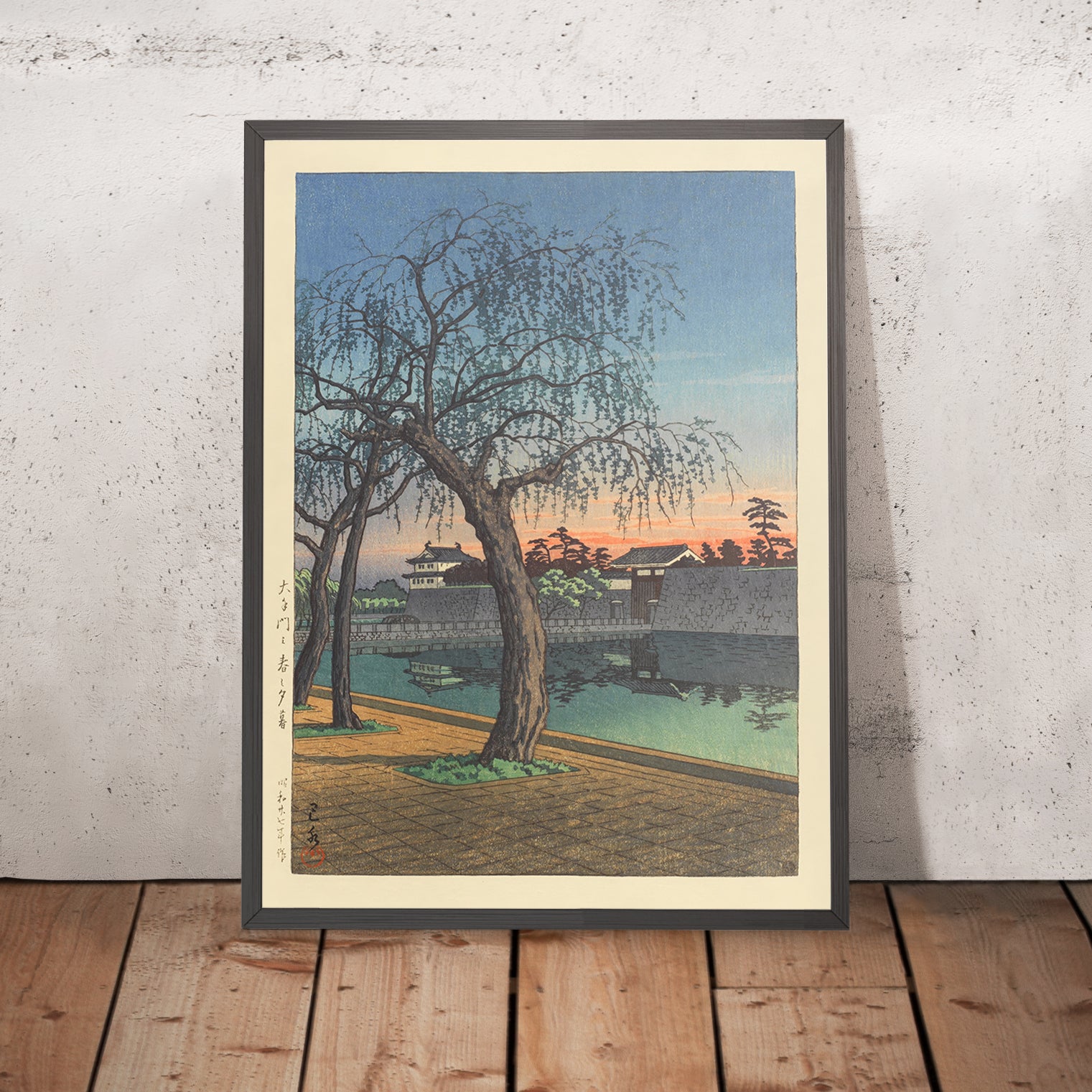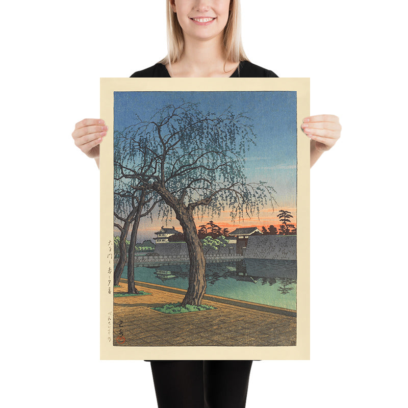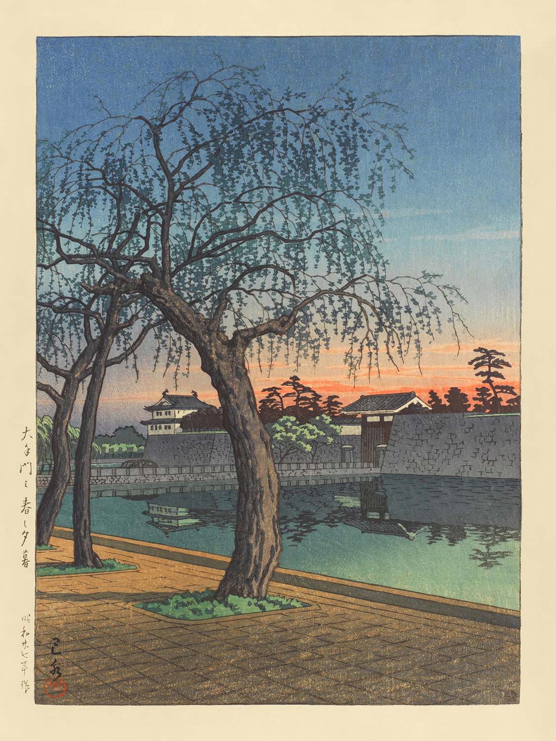 Spring Evening at Otemon Gate by Hasui Kawase (1952) distills the hush of twilight into a luminous woodblock landscape. One of the great landscape printmakers of 20th‑century Japan, Hasui channels the centuries-old ukiyo‑e tradition through the lens of the modern shin‑hanga movement, capturing the quiet poetry of a spring evening as tree branches veil the view and the stately Otemon gate and wall rise beyond a broad reflecting pool. The scene balances the human-made and the natural, inviting the eye to linger on the last warm notes of daylight dissolving into blue.