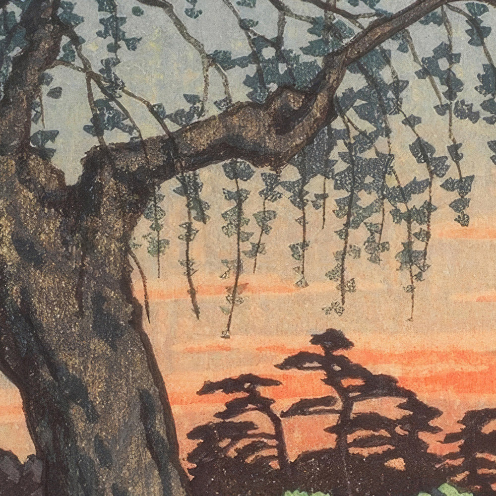 Hasui’s color is masterfully restrained and expressive: deep blues and quiet greens settle across the moat and masonry while gentle gradations of peach and rose hover at the horizon. The bokashi (color gradation) is seamless, guiding the eye across the reflective surface of the water to the gate beyond, while delicate line work evokes bark textures and fine architectural details. It’s a print that rewards repeated viewing—calm, contemplative, and exquisitely balanced—making it a refined focal point for interiors ranging from minimalist and Scandinavian to classic and Japanese‑inspired spaces.
