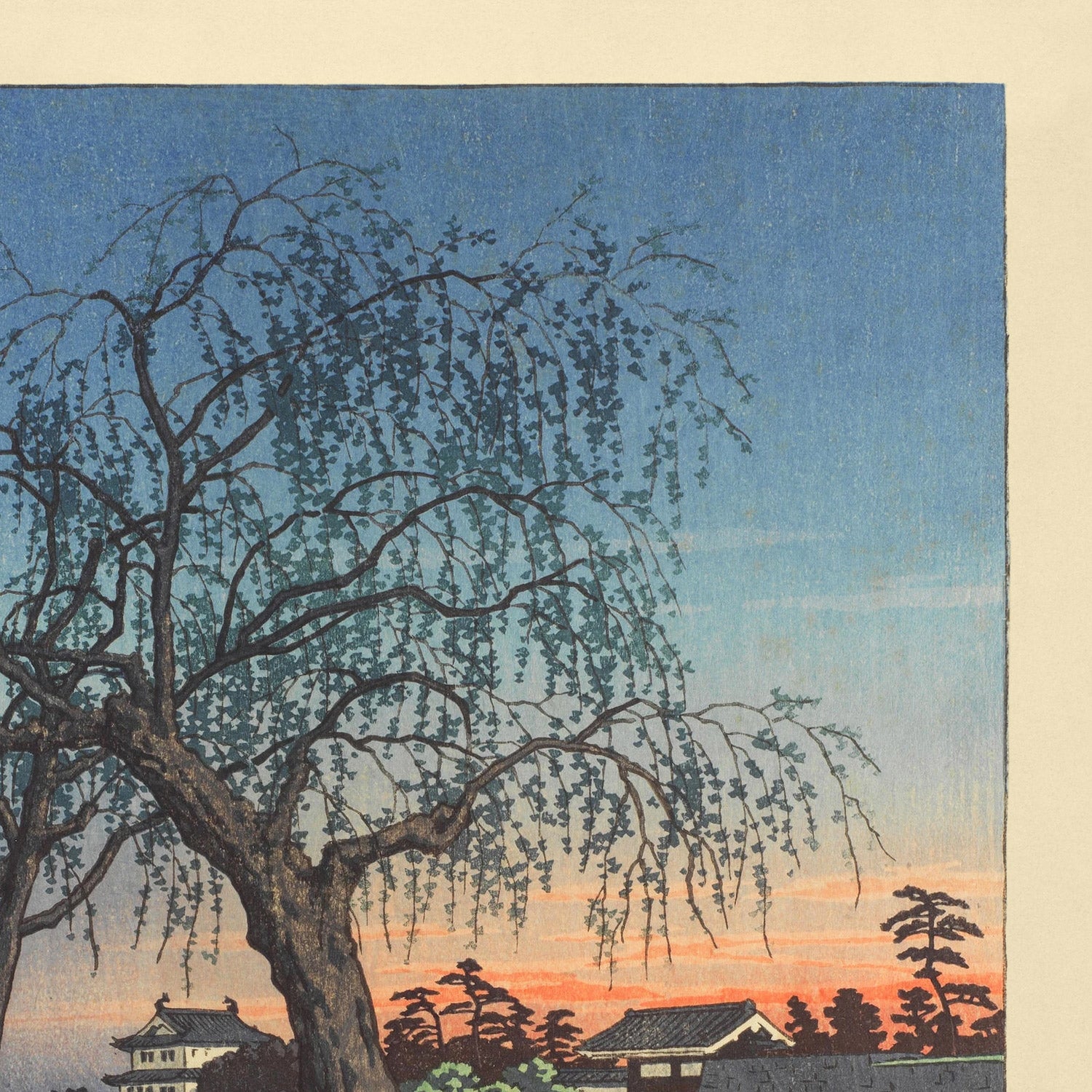 This composition is notable for its serene architecture—the Otemon gate and fortified wall—framed by a sweeping tree in the foreground and mirrored by the still water below. That dialogue between nature and structure, so central to Japanese aesthetics, is heightened by the spring setting and the soft descent of evening. The result is a scene that feels at once timeless and immediate, a quiet interval in which day yields to night and the world seems to pause.