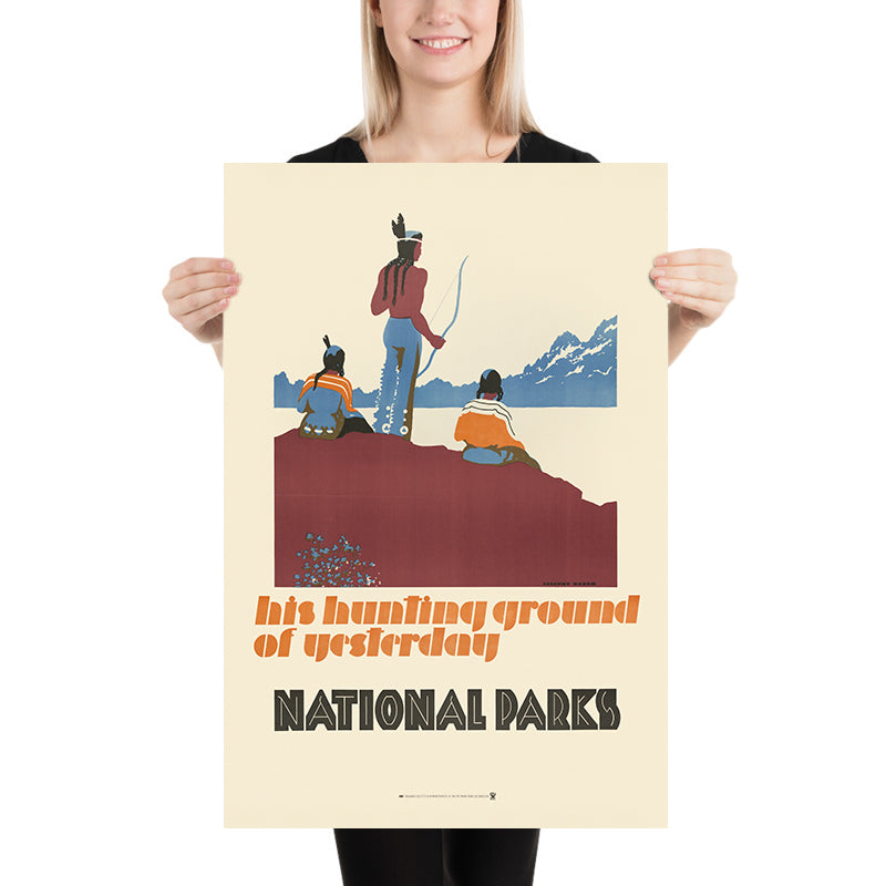 His hunting ground of yesterday, National Parks by Dorothy Waugh (1930) is a striking American travel poster created at the height of the National Park Service’s early publicity campaigns. Waugh’s design belongs to the American Arts and Crafts tradition, where hand-rendered simplicity and reverence for the land meet purposeful typography. The composition foregrounds Indigenous presence within the landscapes that became national parks, placing culture and conservation into the same frame and inviting viewers to consider the human stories behind America’s most celebrated wilderness areas.