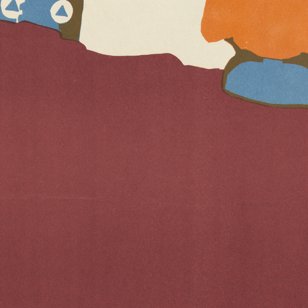 Rendered in a confident palette dominated by red, blue, and orange, the design uses soft gradients and bold blocks of color to sculpt form and atmosphere. Strong, angular figures play against rounder natural contours, creating a poised tension between people and place. Waugh’s typography—clean, emphatic, and purposeful—works as both headline and visual architecture, emblematic of an era when posters told stories through line, letter, and limited color. As wall art, this piece delivers a rich pop of color and a powerful narrative, ideal for interiors that celebrate American craft, Southwestern hues, or mid-century and Arts & Crafts sensibilities.