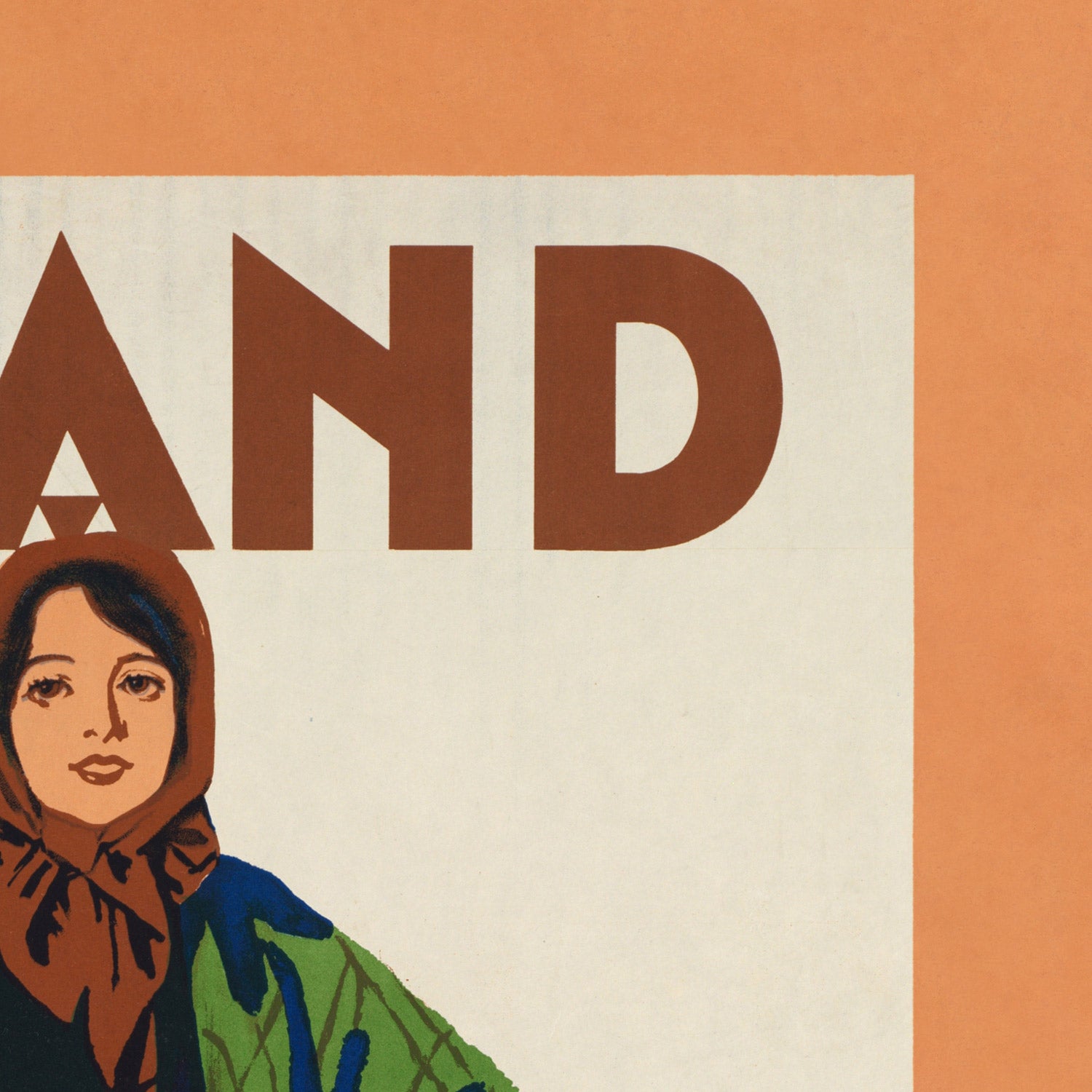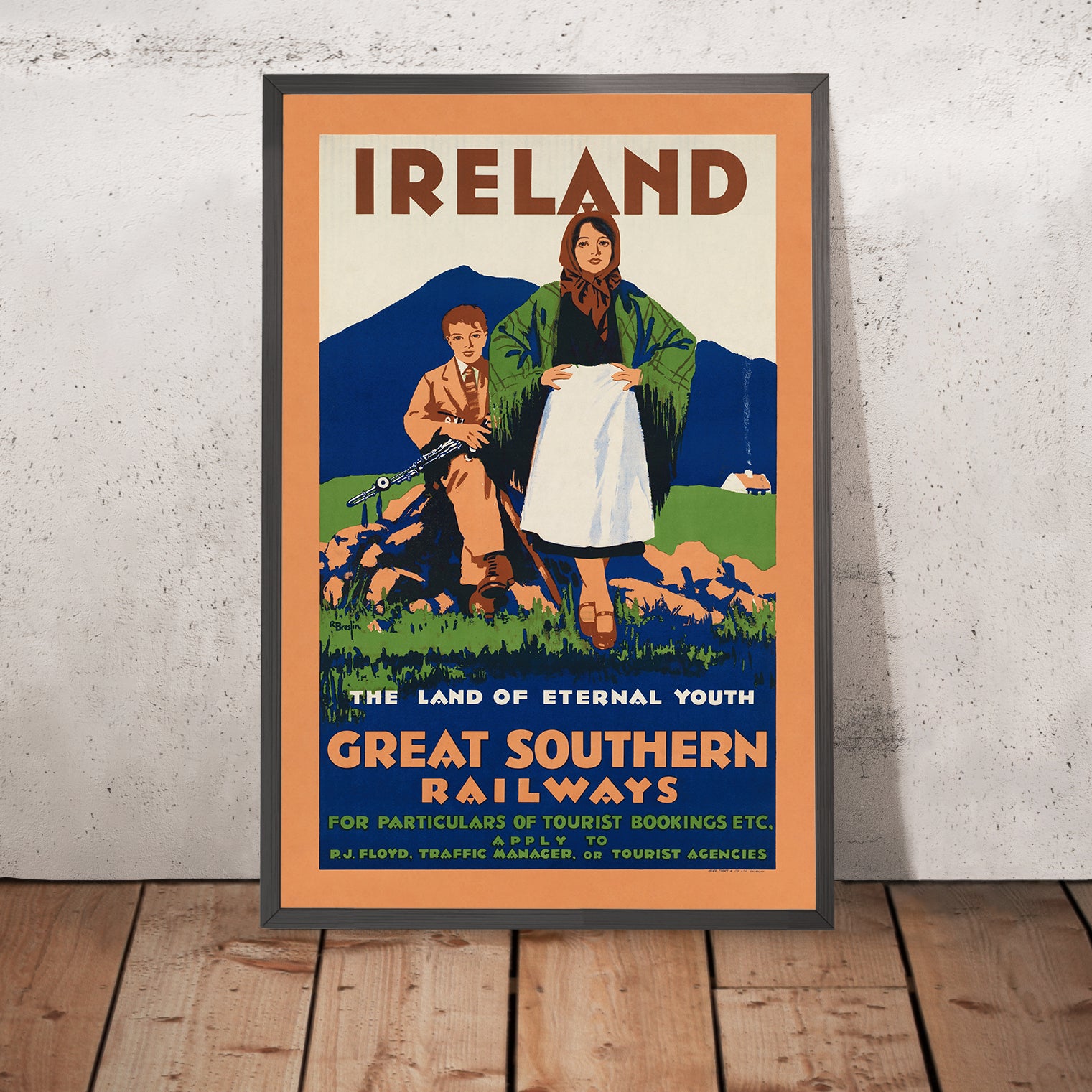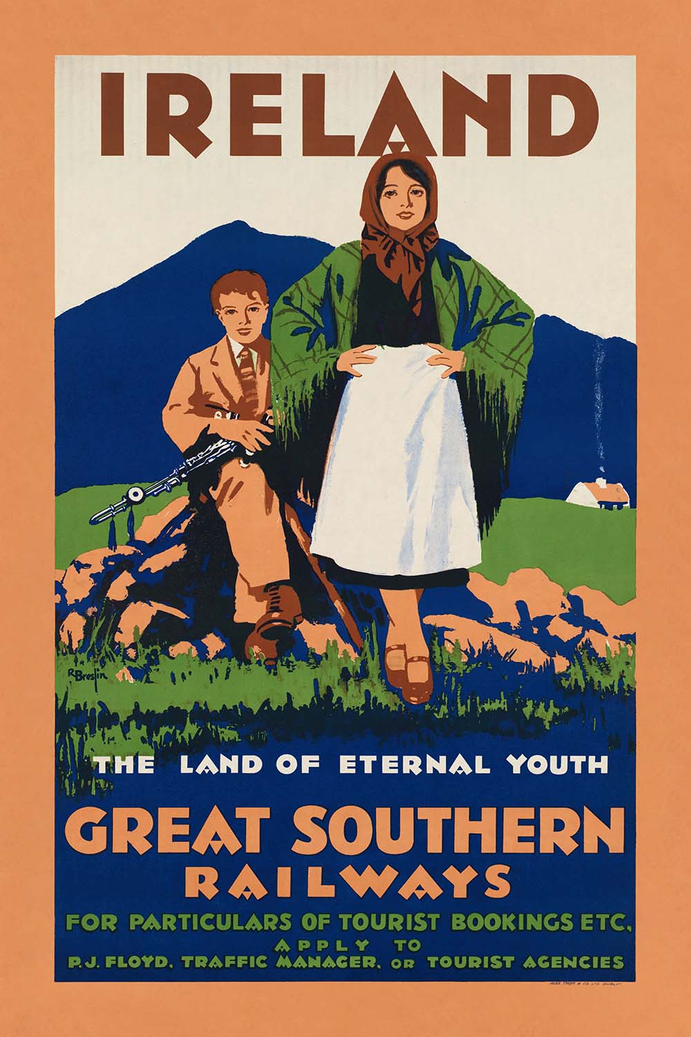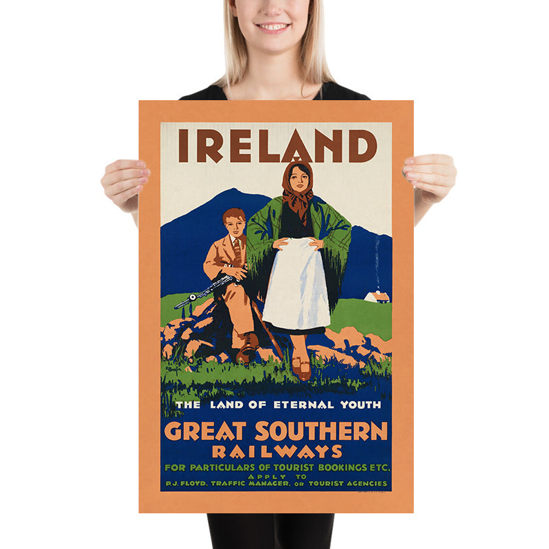 Ireland. The land of eternal youth by R. Breslin is an evocative Art Deco travel poster that captures the romance of the Emerald Isle at the dawn of modern tourism. Likely created in the interwar years, it invites viewers into an idealized Ireland where rugged shores, rolling green hills, and warm community spirit converge. The composition centers on a shawl-clad woman and a young musician, symbols of tradition framed against a luminous landscape, while bold lettering announces both “IRELAND” and the railway that brought visitors to its coasts and countryside. The phrase “the land of eternal youth” nods to Tír na nÓg from Irish mythology, blending timeless legend with the promise of contemporary travel.