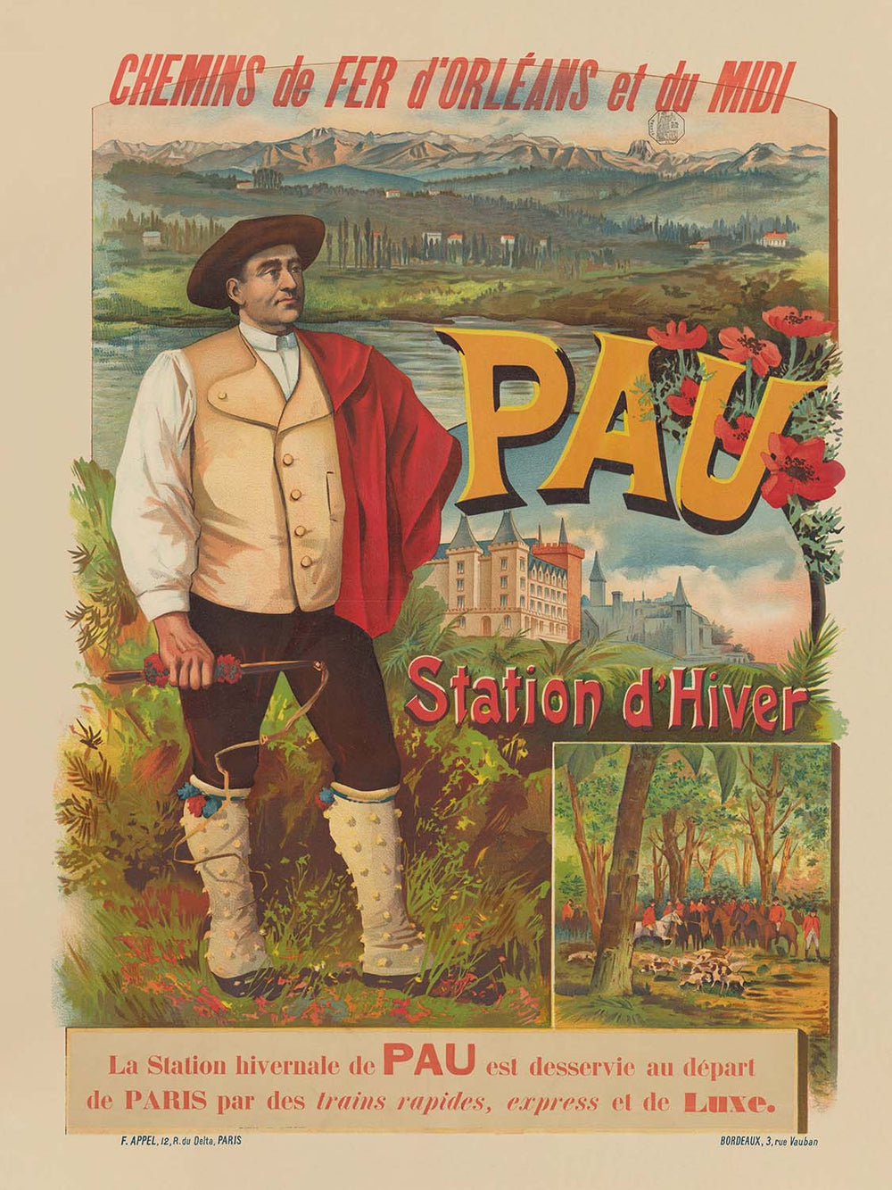 Chemins de Fer d’Orléans et du Midi. Pau, station d’hiver by Lith. F. Appel (1890) invites the viewer to the Pyrenean foothills of southwestern France. Commissioned to promote Pau’s celebrated winter season, the poster celebrates the town’s soft climate, mountain light, and aristocratic pastimes. A broad red headline sweeps across the top, while enormous golden letters spelling “PAU” are entwined with scarlet poppies; to the left, a proudly costumed Béarnais figure stands before the Gave de Pau and the snow-capped Pyrenees, with the turreted Château de Pau—birthplace of Henry IV—prominent in the middle distance. A small vignette shows a lively hunt beneath plane trees, a nod to the town’s fashionable sporting life.