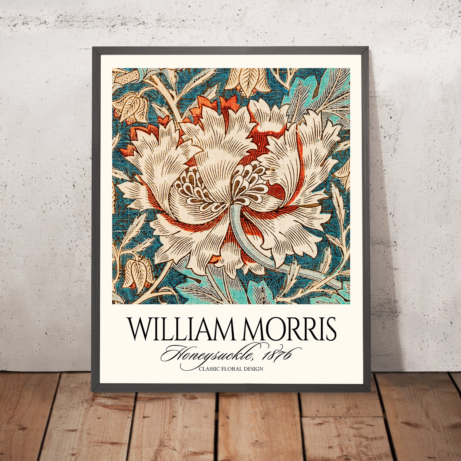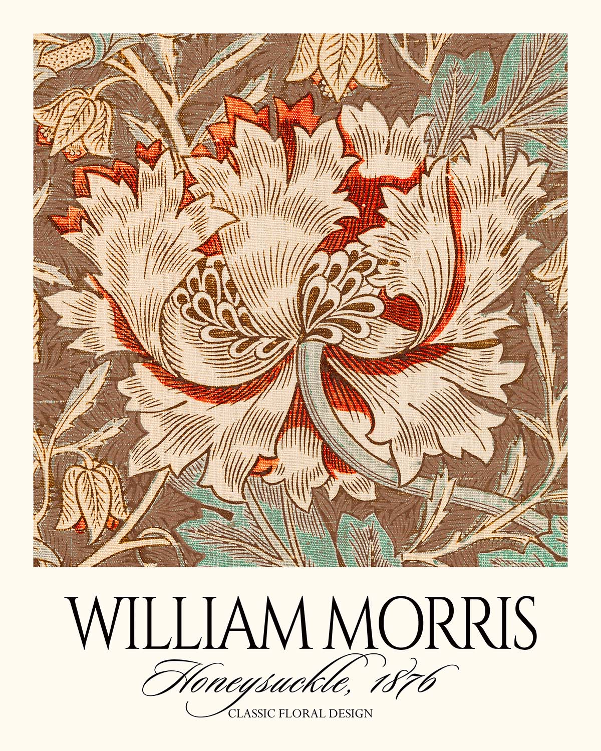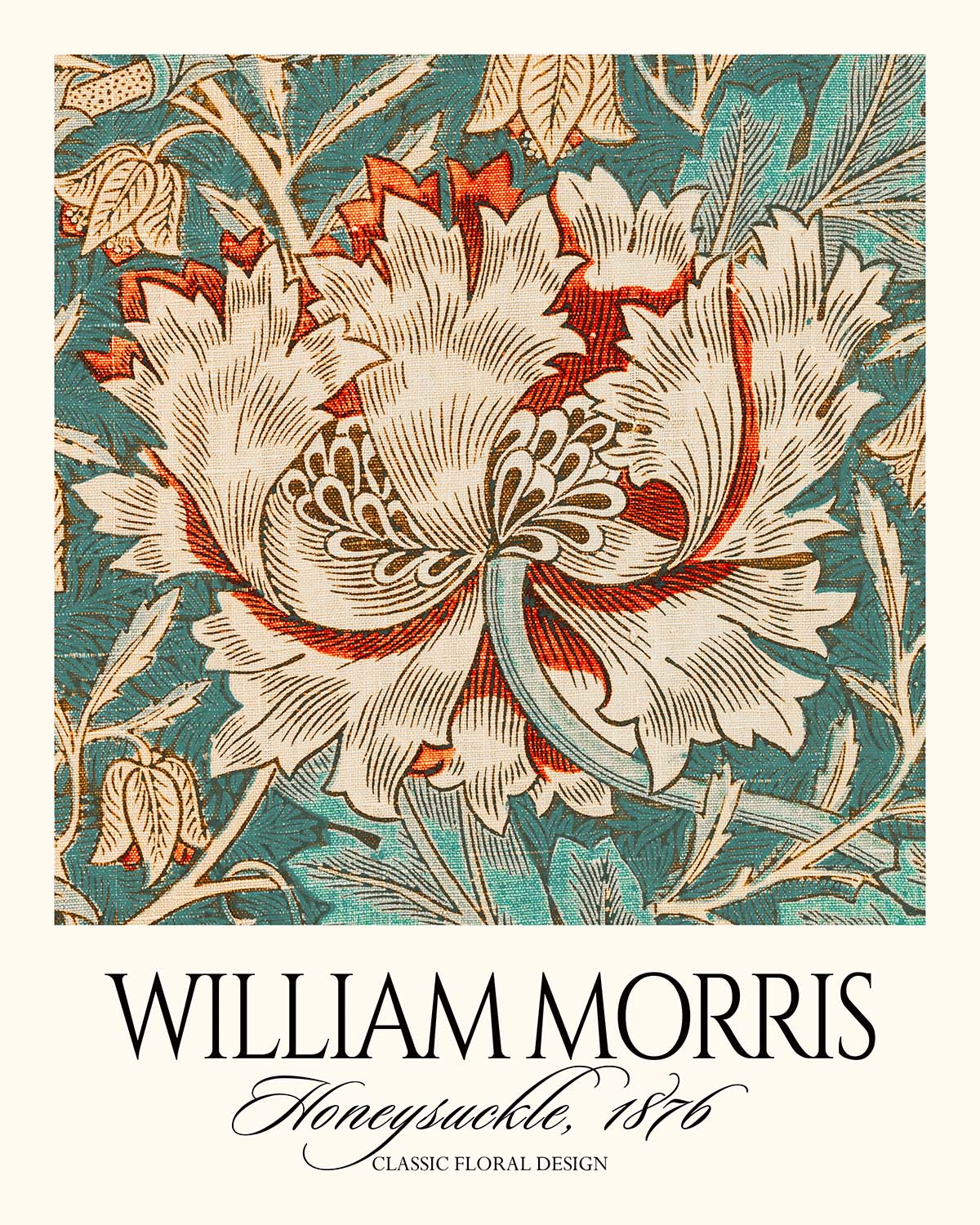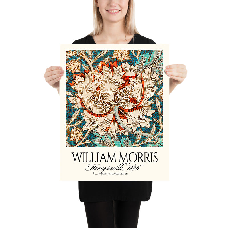 Honeysuckle (Detail) by William Morris, 1876, is a quintessential Arts & Crafts pattern distilled to its most lyrical elements. This restored print isolates a rich section of Morris’s repeat, where winding honeysuckle vines and blossoms interlace in graceful symmetry. First conceived for domestic interiors—very likely as a wallpaper design, though Morris’s motifs often migrated across carpets, curtains, and other textiles—the pattern celebrates nature’s architecture and the dignity of handcraft at the height of Victorian design reform.