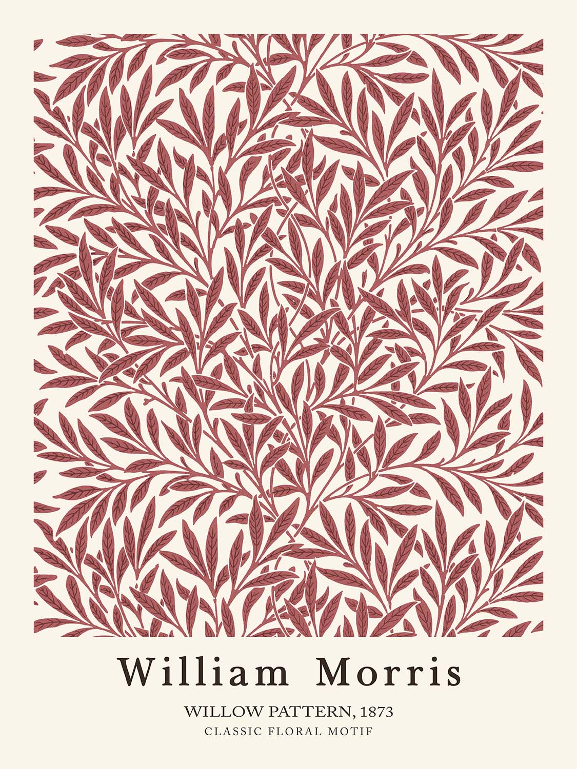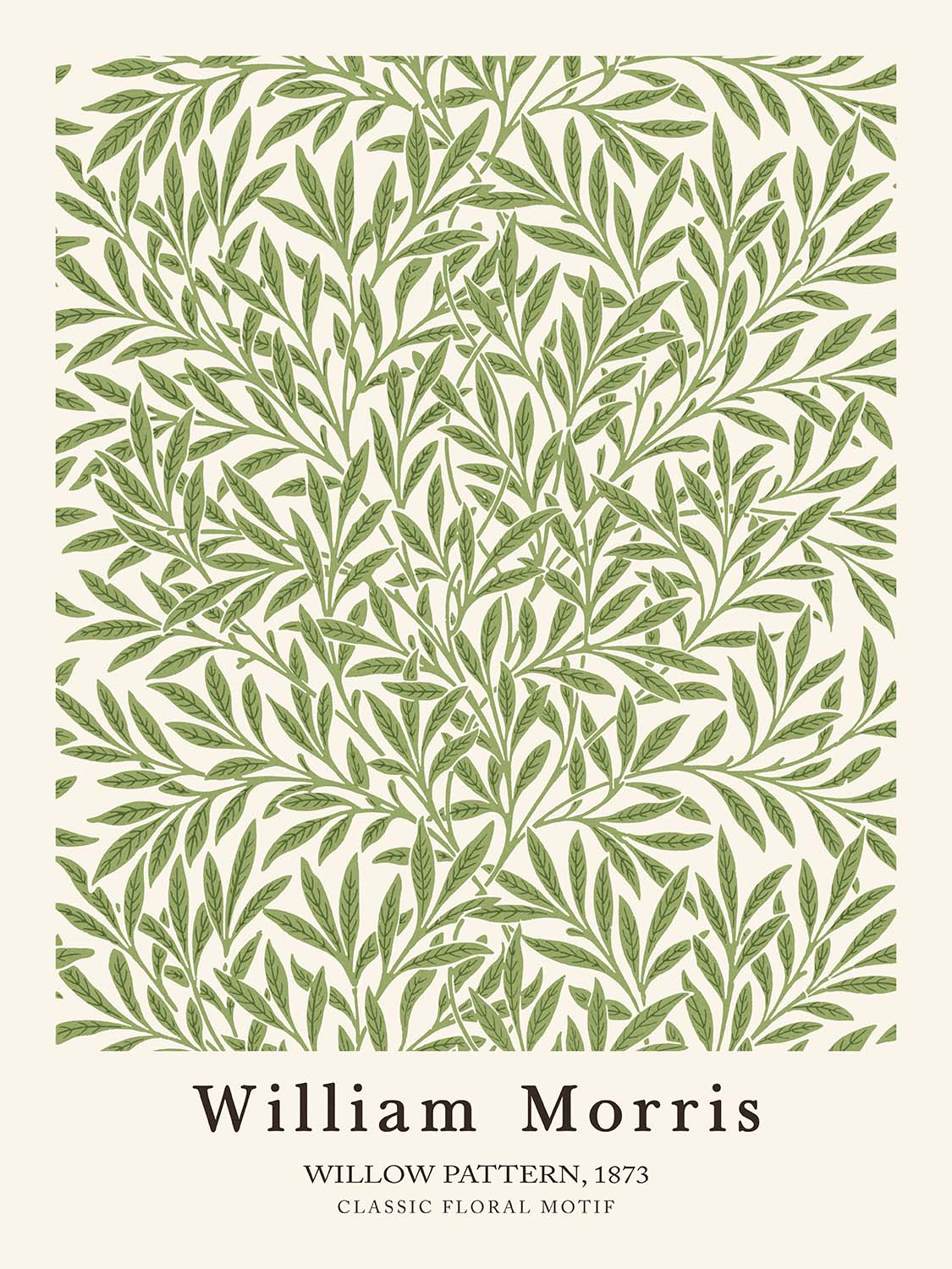 Willow Pattern by William Morris, created in 1873, is a quintessential Arts & Crafts design that brings the quiet poetry of nature into the home. With willow (Salix) leaves arranged in rhythmic repeats, the pattern celebrates hand-crafted beauty and the dignity of traditional ornament. Most likely conceived as a wallpaper—though Morris’s designs were often adapted for carpet, curtain, and other textile uses—this motif distills the grace of trailing boughs into an elegant, living surface that feels both historic and timeless.