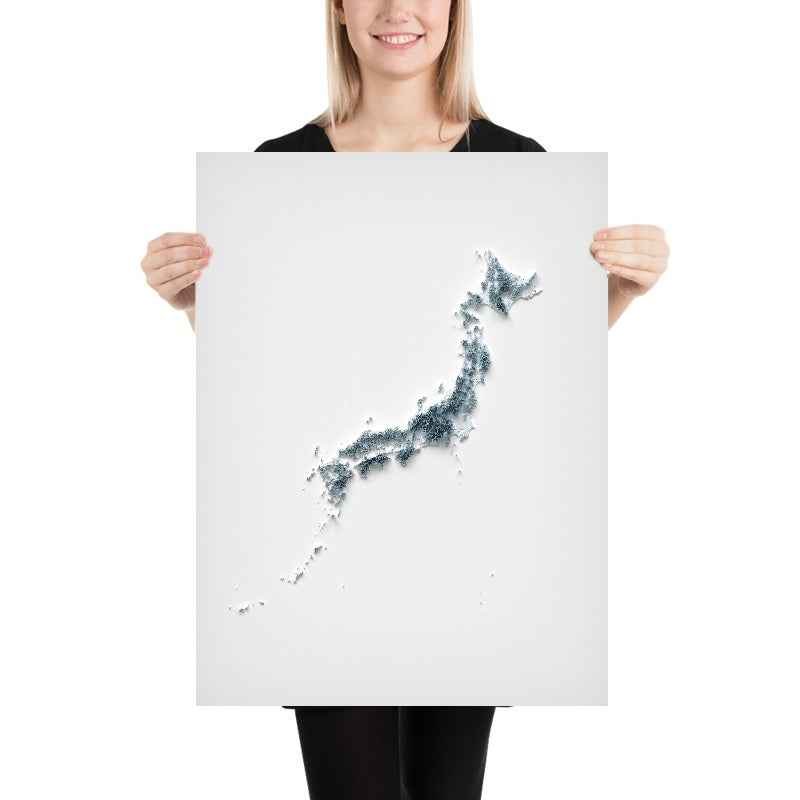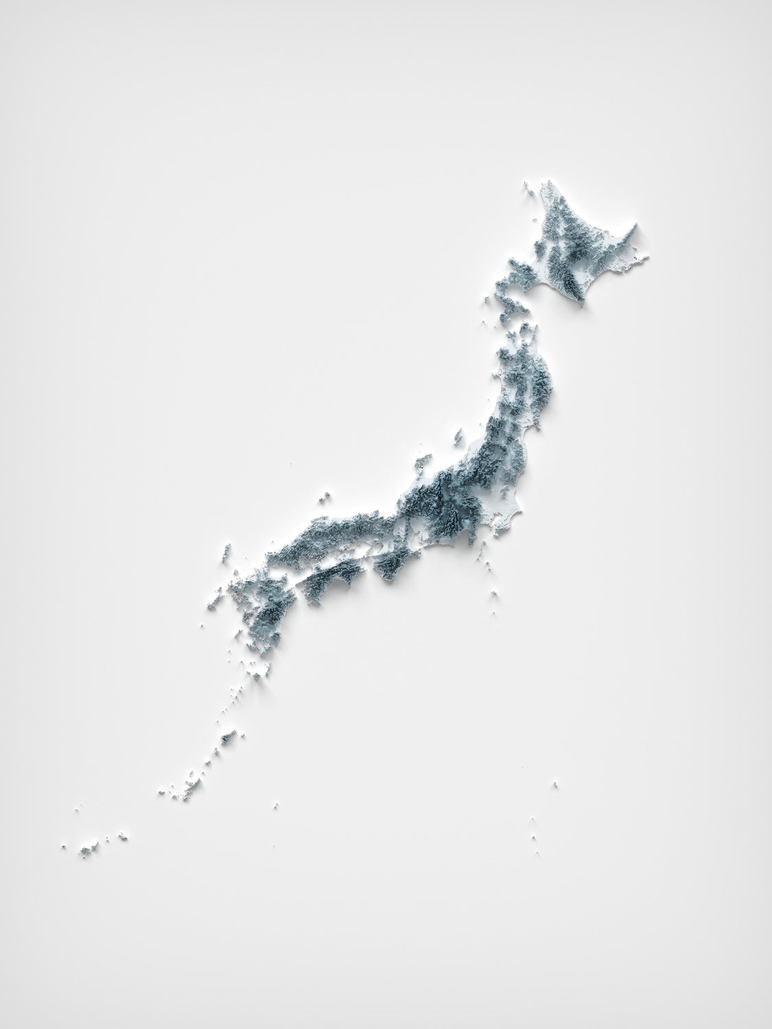 Questa è una mappa topografica in rilievo minimalista del Giappone, creata da The Unique Maps Co. e valorizzata dal nostro esclusivo processo Unique 3D, protetto da marchio registrato. Senza etichette, strade o città, sono le forme del territorio a occupare il centro della scena. Una luce morbida e radente coglie le creste delle dorsali e i coni vulcanici, mentre ombre sottili si depositano nelle valli fluviali, negli insenature costiere e nelle caldere, rivelando a colpo d’occhio il terreno notoriamente spettacolare del Paese.