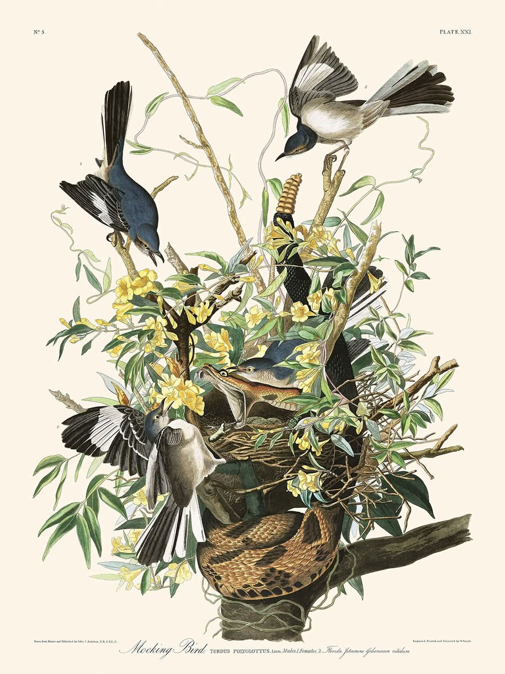 L'illustrazione del Mocking Bird è particolarmente notevole non solo per la sua bellezza artistica ma anche per il contesto aneddotico fornito da Audubon, che descrive la vita di questi uccelli nei vivaci ecosistemi dell'America primitiva. L'opera d'arte funge sia da capolavoro scientifico che da omaggio alla diversità delle creazioni della natura.