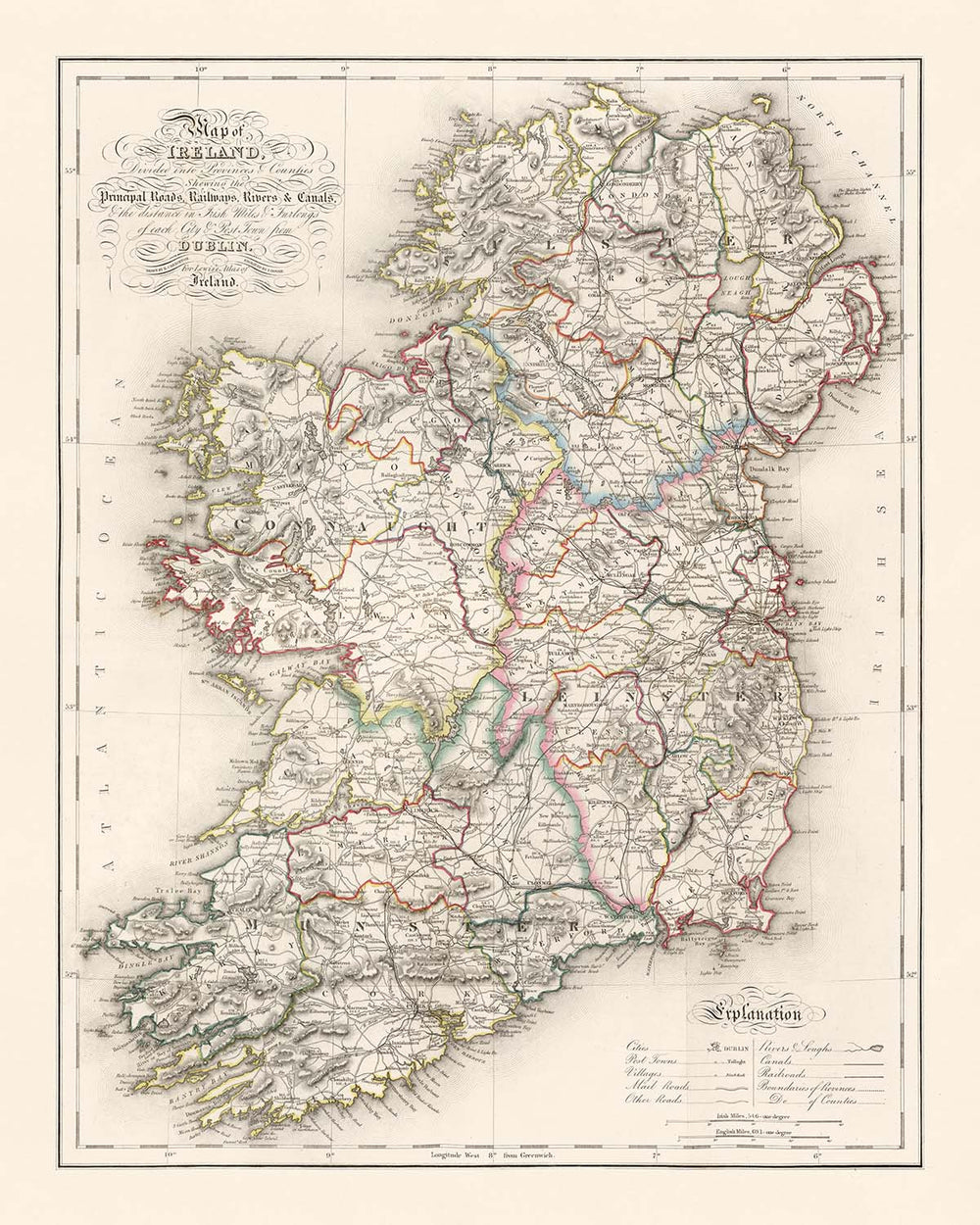 The Map of Ireland, divided into provinces & counties, published in 1846 as part of Lewis’s Atlas of Ireland, is a masterclass in lucid design and empirical ambition. Samuel Lewis’s vision is realized through R. Creighton’s precise draughtsmanship and I. Dower’s clean, confident engraving, rendering the island with disciplined clarity. Subtle outline coloring distinguishes Ulster, Leinster, Munster, and Connacht, while hachures lend a sculptural dimension to uplands and ranges. A carefully composed legend deciphers symbols for principal roads, mail routes, emerging railways, rivers, lakes, and canals, guiding the eye from coastline to interior. The result is both elegant and exacting: a national portrait that balances administrative order with the living geography of towns, waters, and relief.