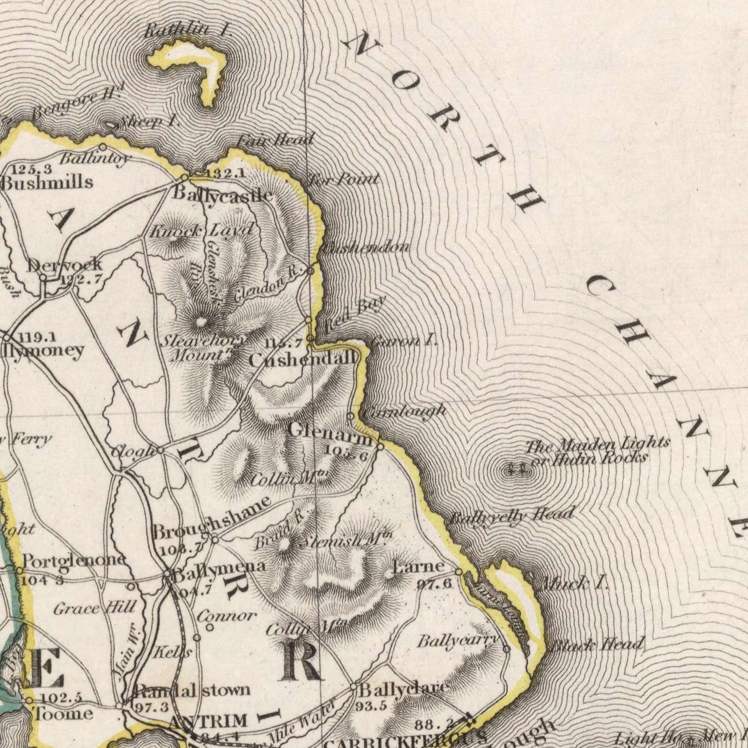 Geography here is rendered as narrative terrain. Hachures model the weight of the Wicklow Mountains and the rugged forms of the southwest, while soft gradations cue the gentler expanses of the midlands. The map’s hydrology is an organizing presence: the Shannon unfurls like a spine through Connacht and Munster; Lough Neagh broadens the north; Lough Corrib and other western waters nestle against stony coasts. Estuaries and bays articulate the shoreline, from the inlets of Cork and Kerry to the shallows near Dublin and Louth, and the surrounding seas—across the North Channel and St George’s Channel—situate Ireland within its maritime world. Every feature is composed to show how landform and waterway govern movement and settlement.