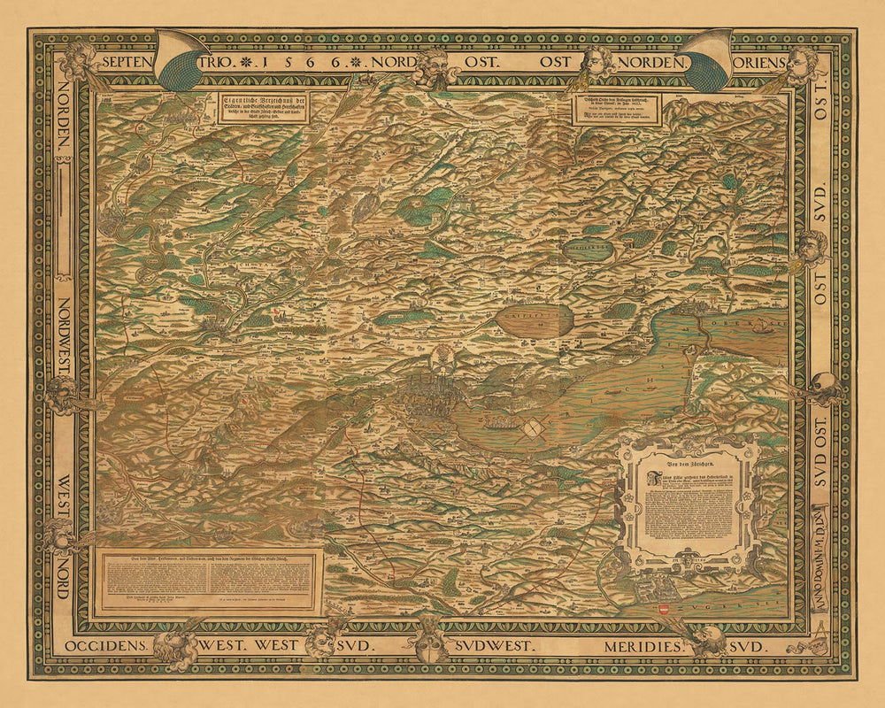 La mappa è orientata a nord-est, una caratteristica unica che aggiunge al suo fascino storico. Il bordo decorativo è adornato con teste di vento e teschi feroci, ognuno meticolosamente dettagliato, aggiungendo un tocco di arte rinascimentale alla mappa. La rosa dei venti nel Lago di Zurigo e gli scudi con lo stemma di Zurigo migliorano ulteriormente l'appeal visivo della mappa. In basso a destra, lo stemma e il nome di Jodocus Murer, insieme a un paio di compassi, segnano orgogliosamente l'identità e l'abilità del cartografo.