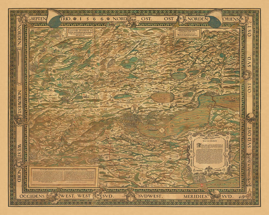 Il significato storico della mappa di Murer si estende oltre il suo fascino estetico. Essa rappresenta una testimonianza delle tecniche cartografiche e delle sensibilità artistiche del periodo rinascimentale. La capacità della mappa di trasmettere sia il paesaggio geografico che quello culturale di Zurigo nel XVI secolo la rende un artefatto prezioso. Che tu sia un collezionista, uno storico o semplicemente un ammiratore della fine cartografia, questa mappa offre un viaggio affascinante nel tempo, rivelando la complessa bellezza e la profondità storica del cantone di Zurigo.