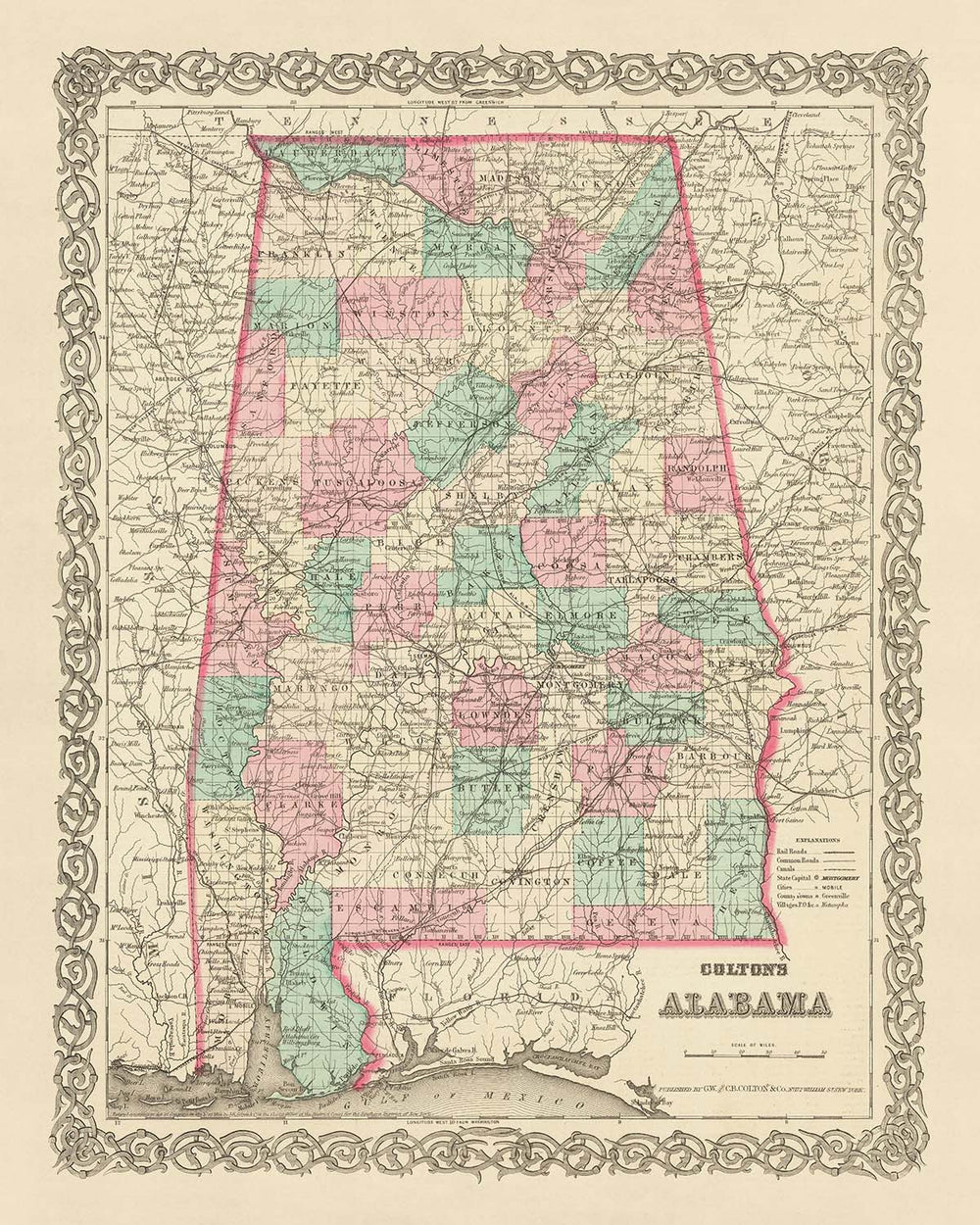 Immerse yourself in the rich history of the United States with this meticulously detailed map of Alabama, crafted by the esteemed mapmaker J. H. Colton in 1855. This remarkable piece is a testament to the artistry and precision that Colton brought to his craft, a representation of his status as one of the finest American mapmakers of his era.
